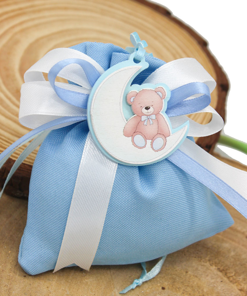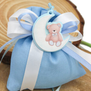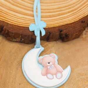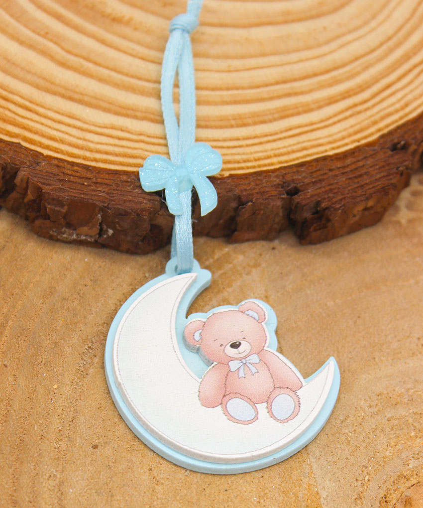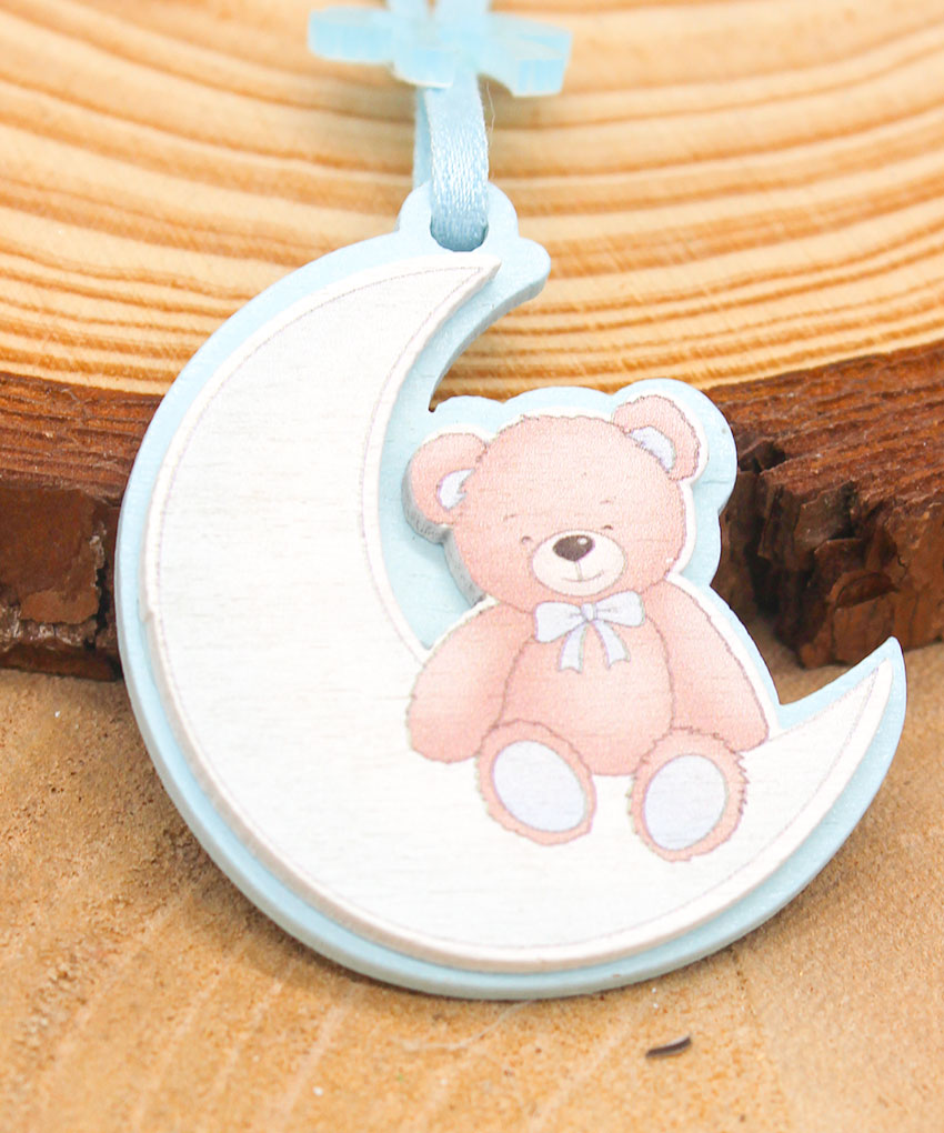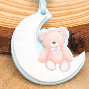 Appendino in Legno Luna con Orsetto Celeste – Bomboniera Nascita e Battesimo