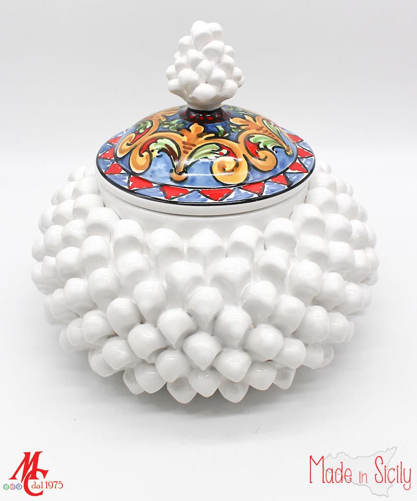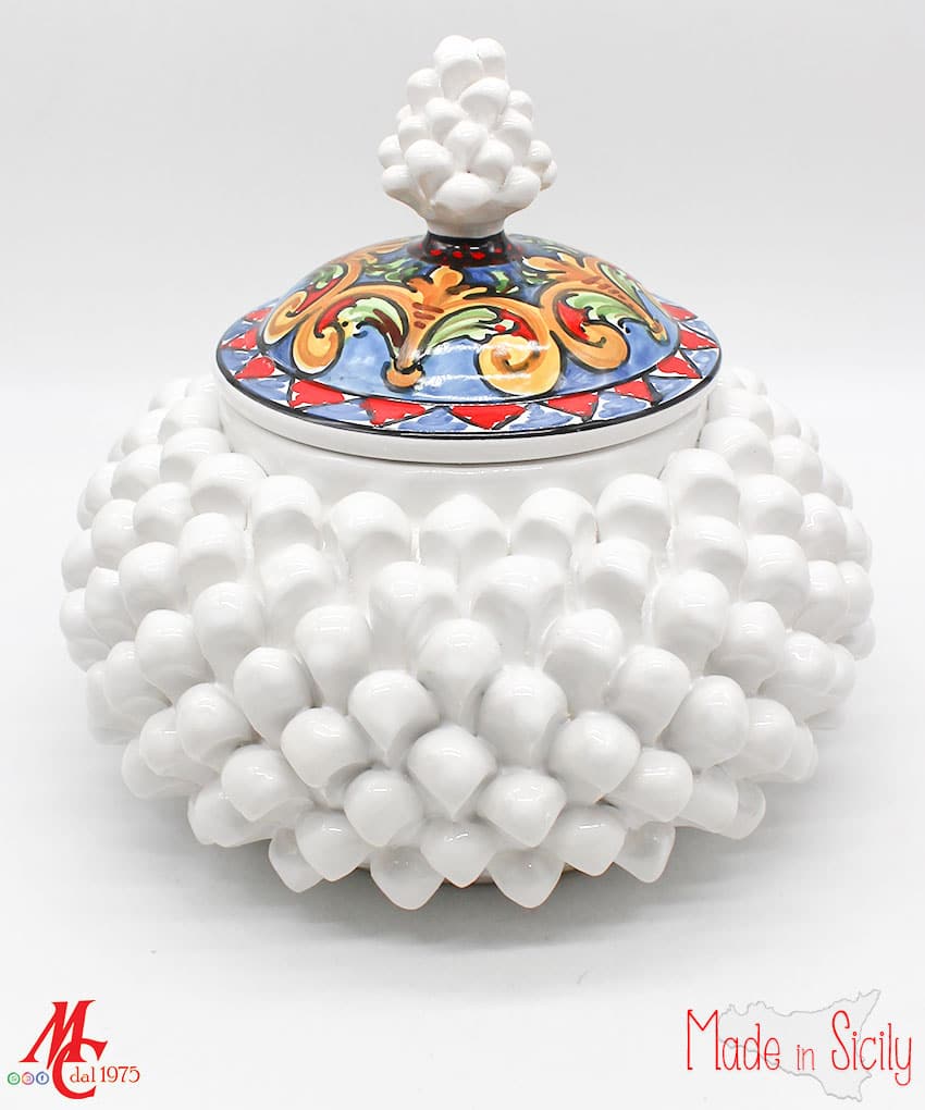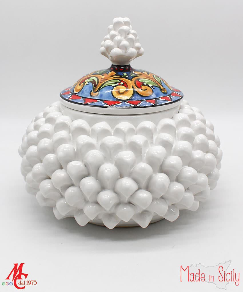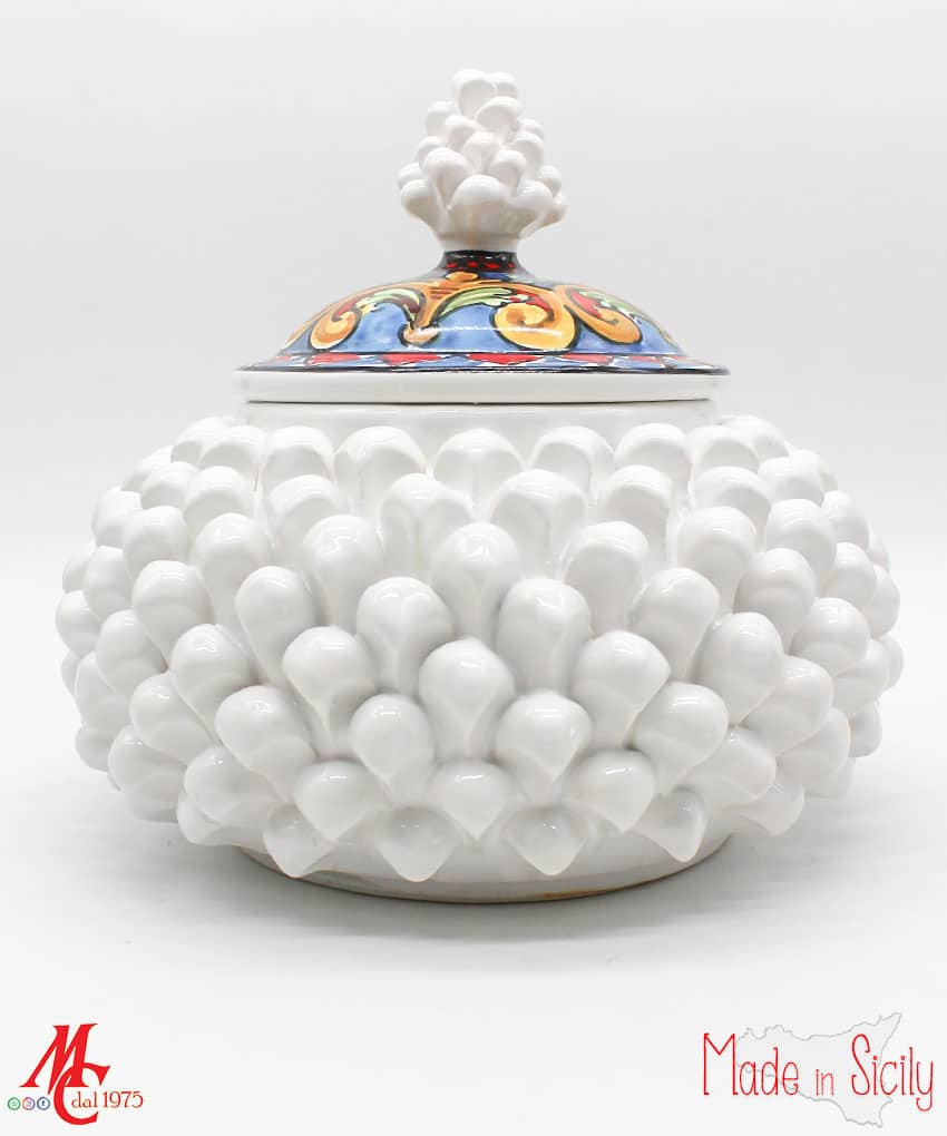 Gli abili ceramisti siciliani realizzano da sempre splendide pigne di ogni dimensione e colore. Questa tradizione nasce dall’usanza di realizzare pigne per ornare le testiere dei letti in ferro battuto, nelle camere da letto degli sposi. Un segno di buon augurio e di prosperità. L’abbondanza dei semi della pigna era simbolo di unione immortale e fertilità.