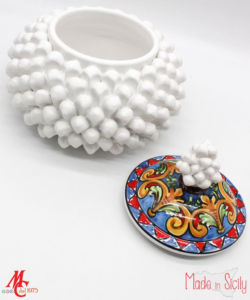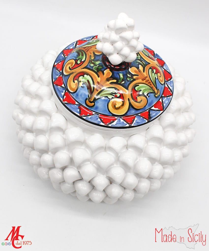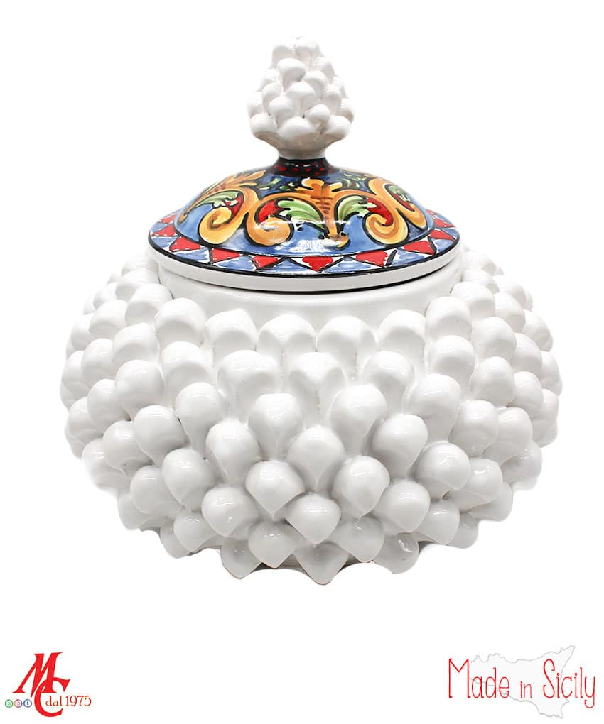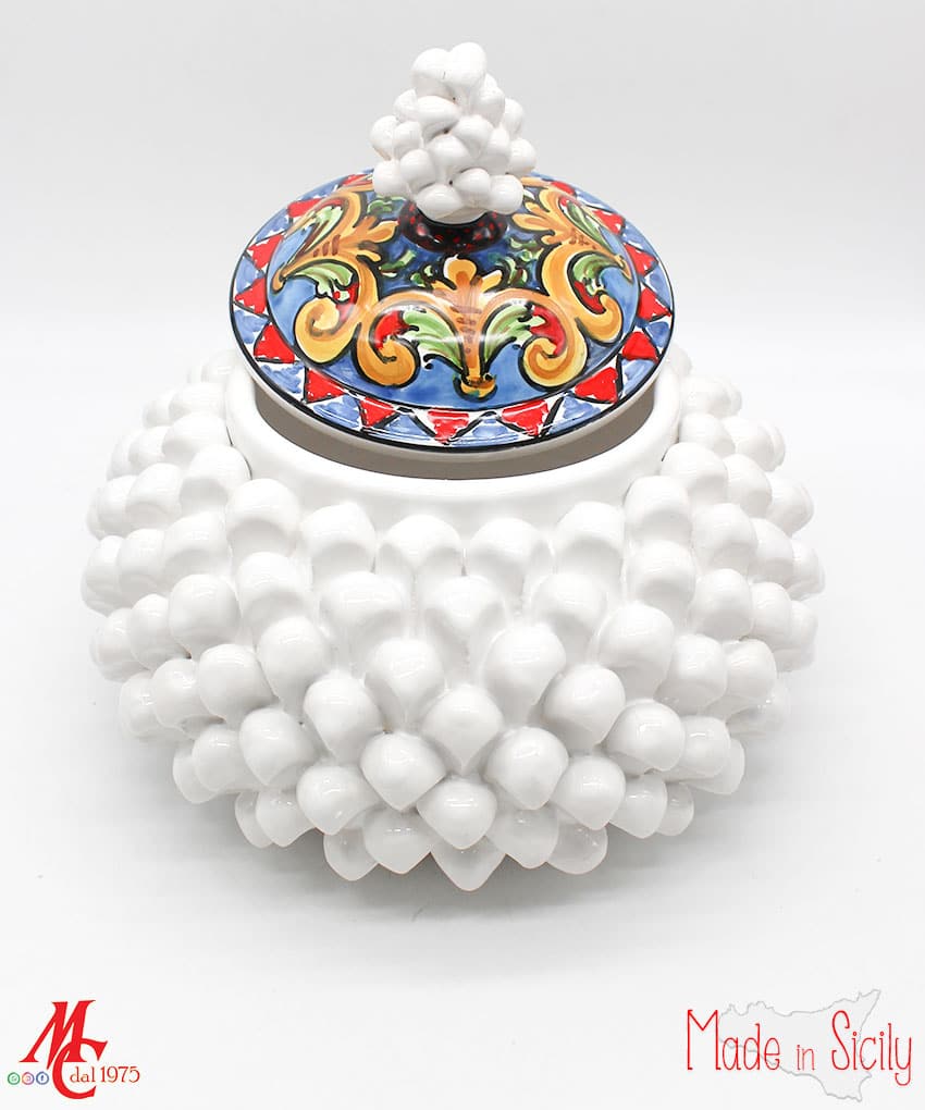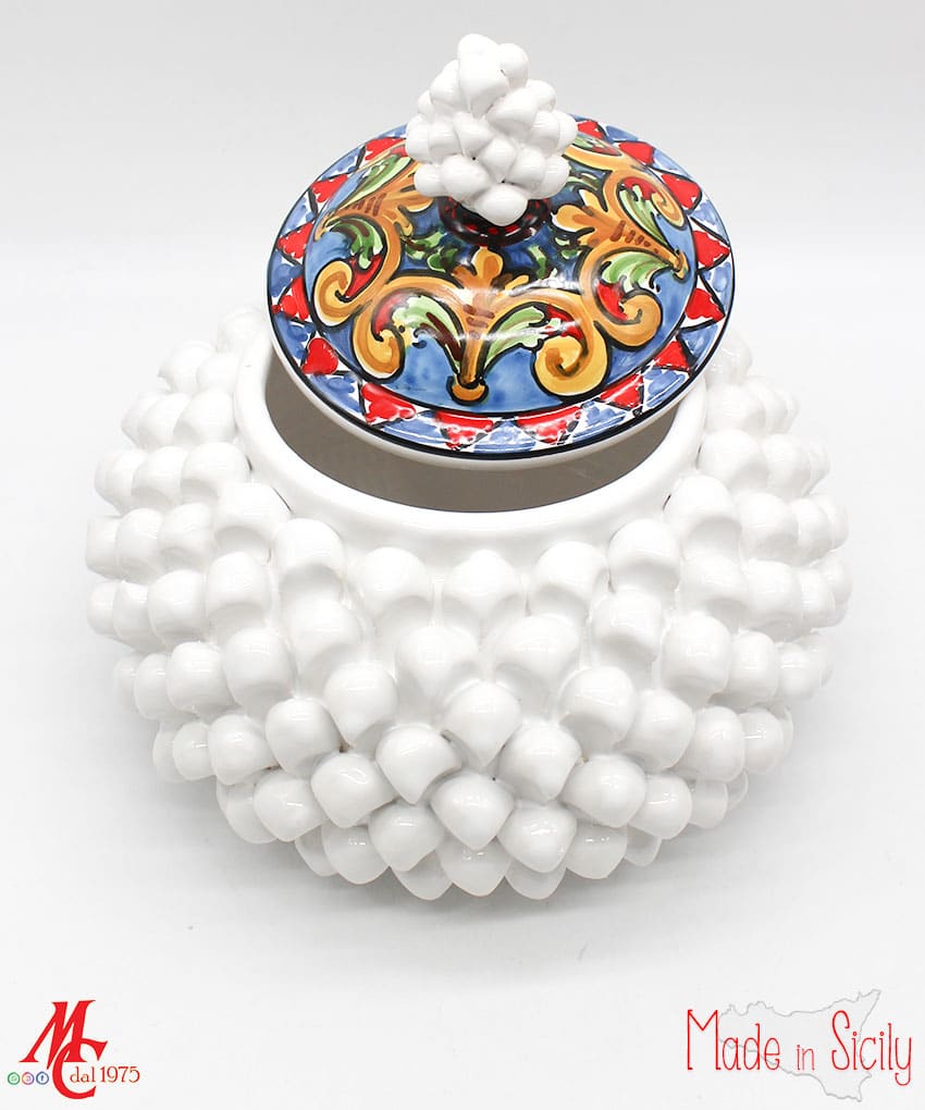 Gli abili ceramisti siciliani realizzano da sempre splendide pigne di ogni dimensione e colore. Questa tradizione nasce dall’usanza di realizzare pigne per ornare le testiere dei letti in ferro battuto, nelle camere da letto degli sposi. Un segno di buon augurio e di prosperità. L’abbondanza dei semi della pigna era simbolo di unione immortale e fertilità.