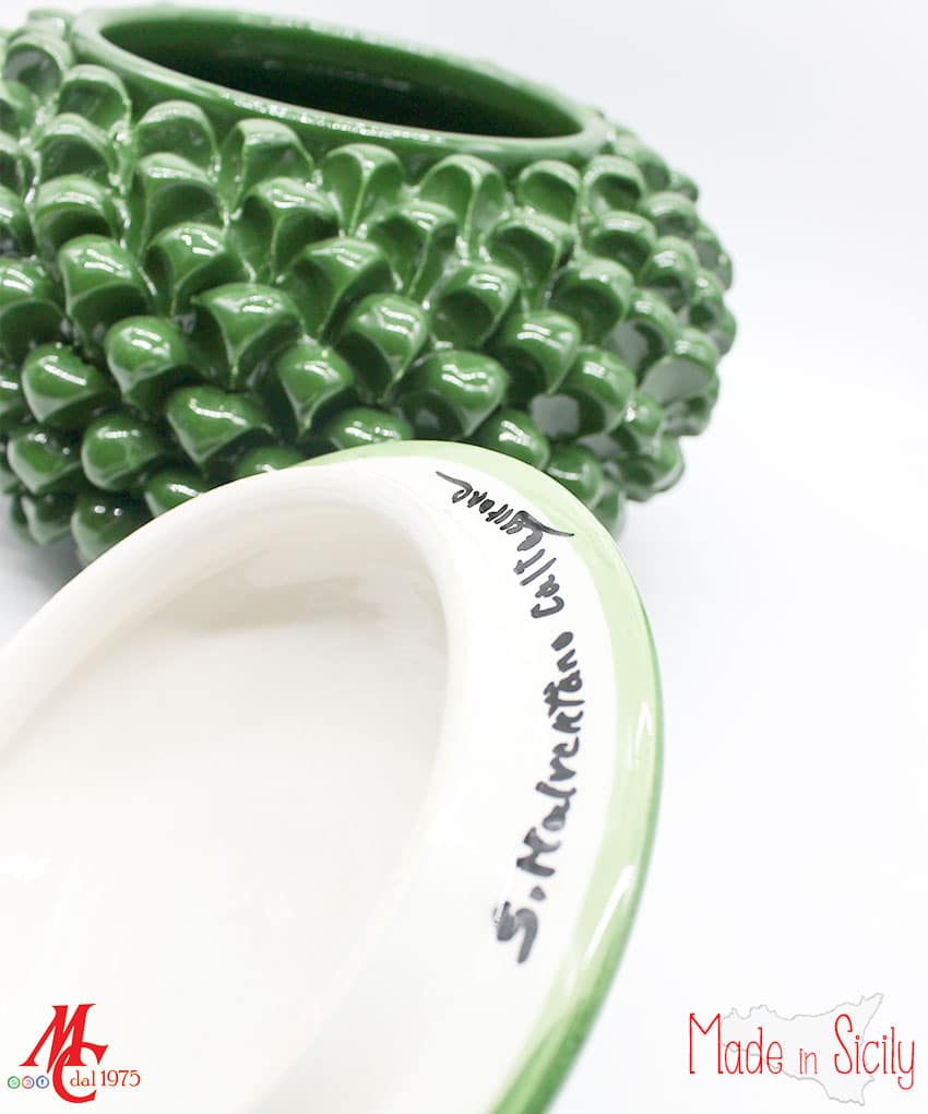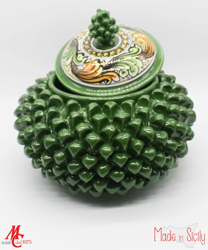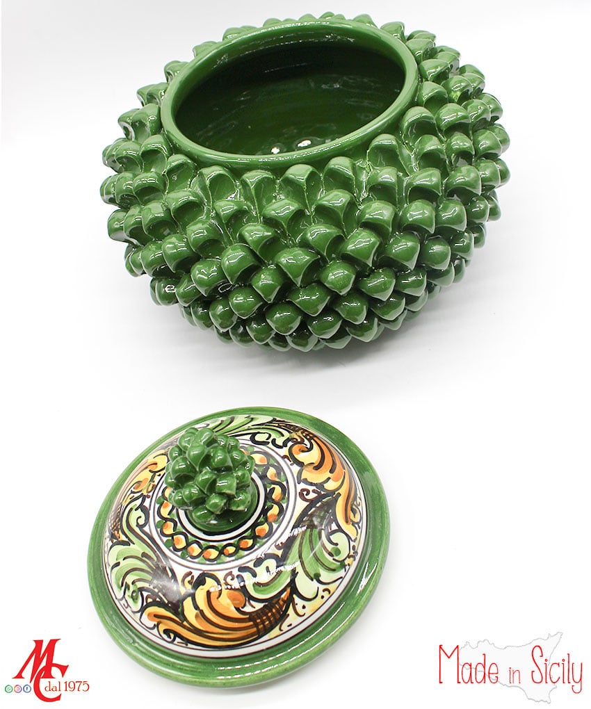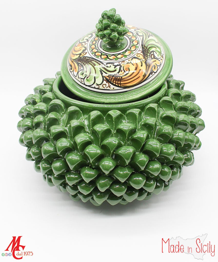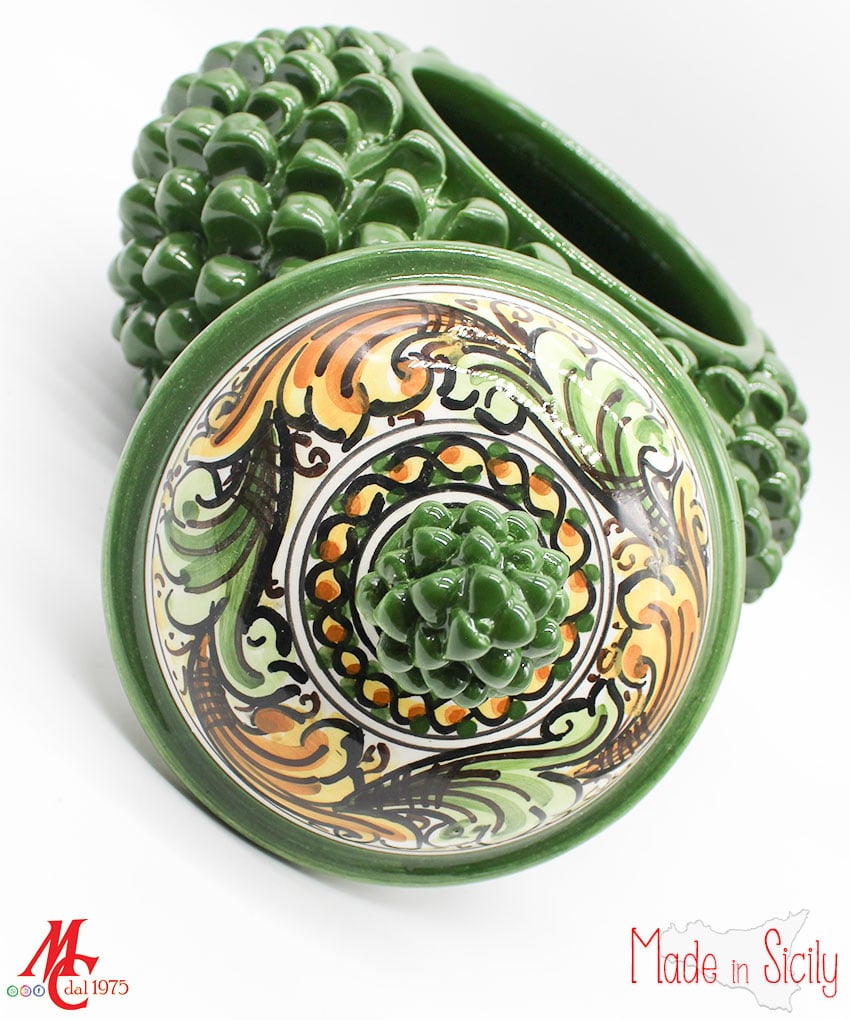 Gli abili ceramisti siciliani realizzano da sempre splendide pigne di ogni dimensione e colore. Questa tradizione nasce dall’usanza di realizzare pigne per ornare le testiere dei letti in ferro battuto, nelle camere da letto degli sposi. Un segno di buon augurio e di prosperità. L’abbondanza dei semi della pigna era simbolo di unione immortale e fertilità.