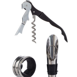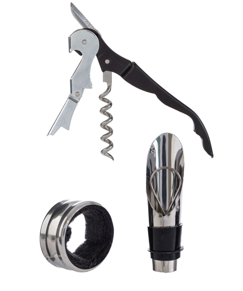 Un set elegante e raffinato di 3 accessori per vino racchiusi in un calice decorativo. Realizzati in metallo di qualità, uniscono estetica e funzionalità, perfetti per gli amanti del buon vino.
