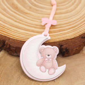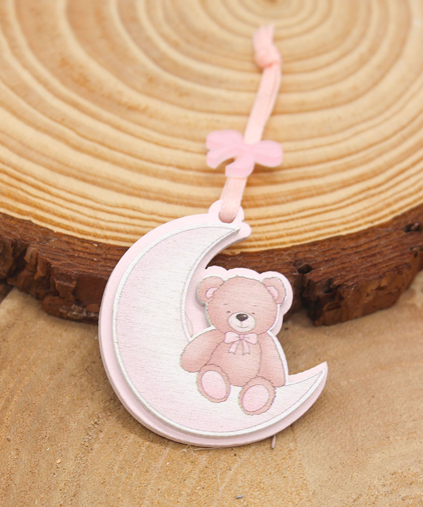 Bomboniera Appendino Legno Luna Orsetto Rosa 4,5×4,5 cm Completo di Confezione