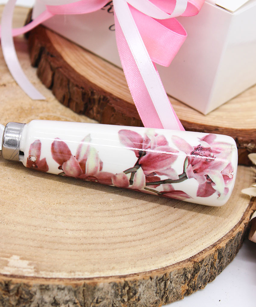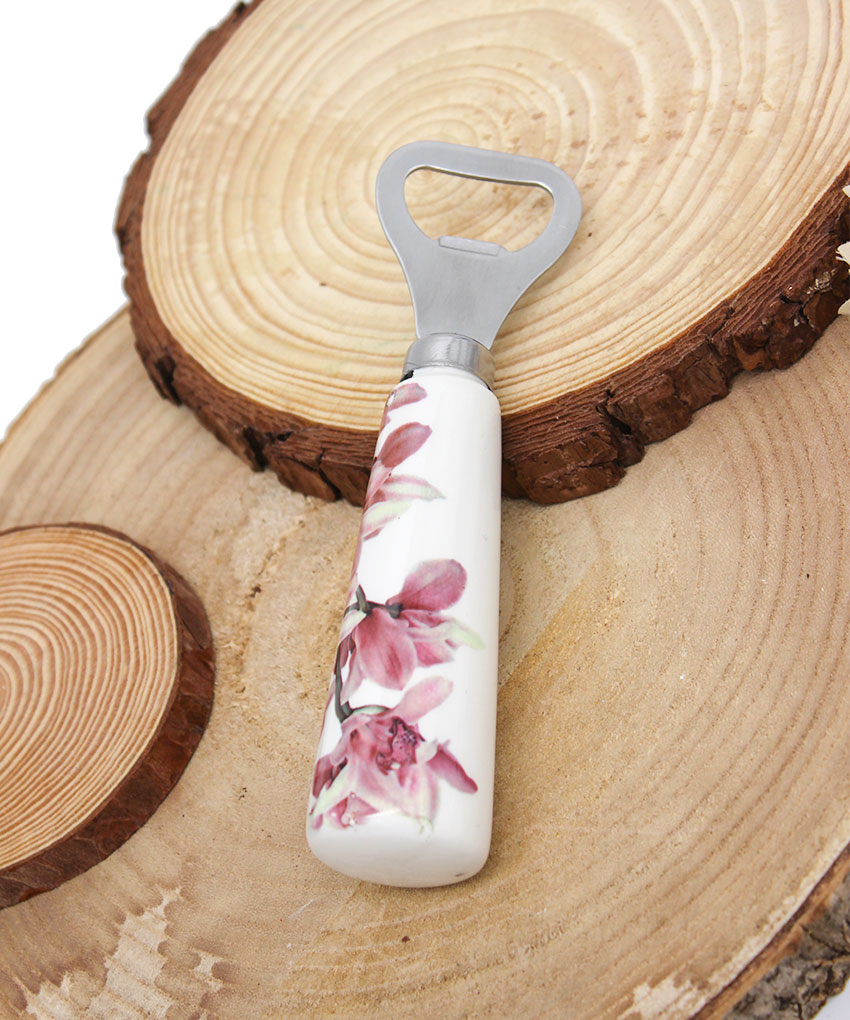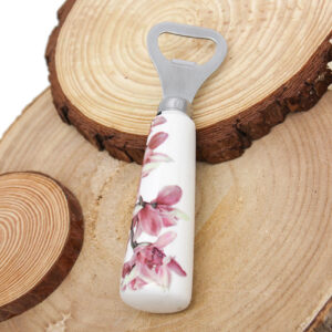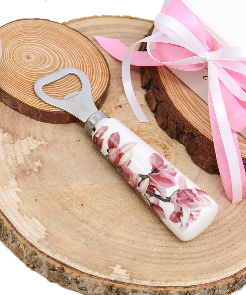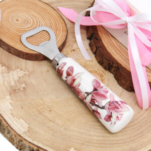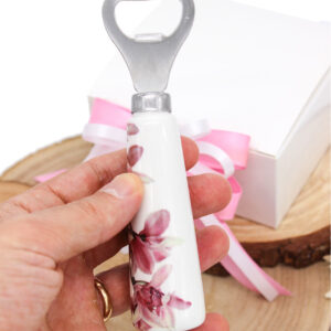 Elegante bomboniera apribottiglie con raffinato decoro floreale, realizzata in porcellana e metallo. Un oggetto utile e allo stesso tempo decorativo, perfetto per chi desidera donare agli invitati un ricordo pratico ma curato nei dettagli.