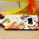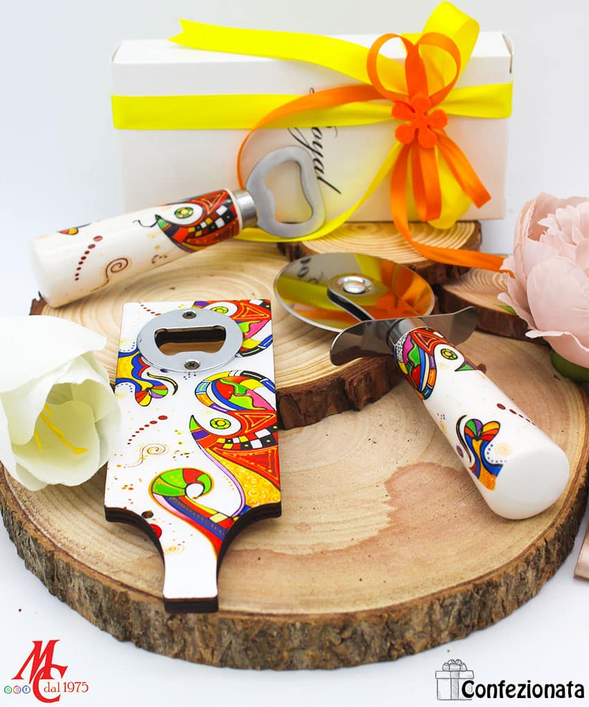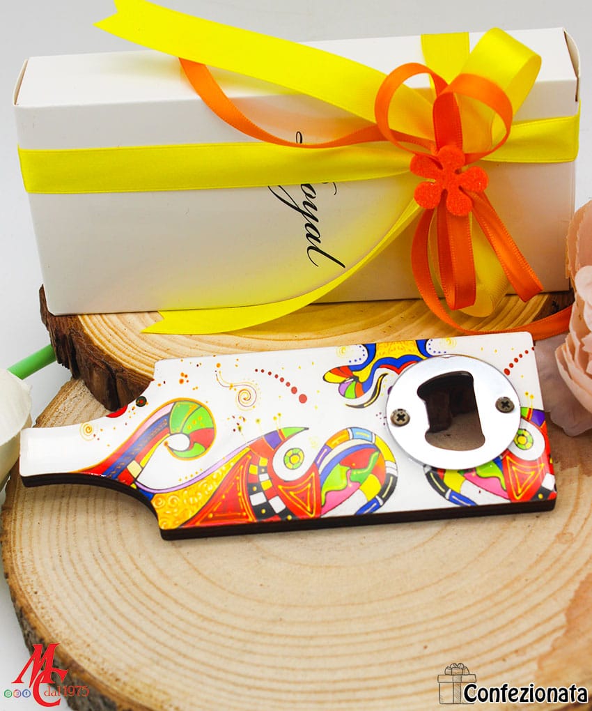 - Modello: Bomboniera Utile con Confezione Inclusa – Apribottiglie con Base in Legno Decorata in Stile Pop Art