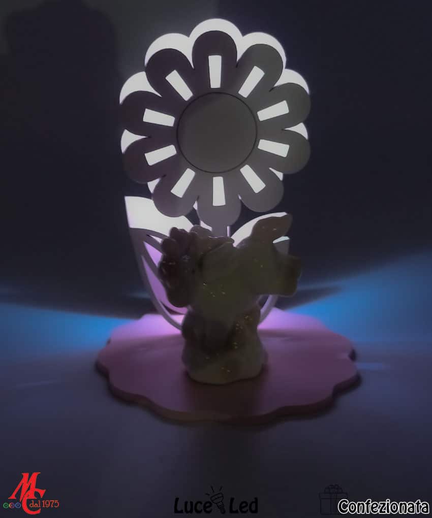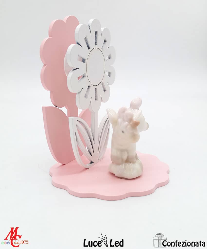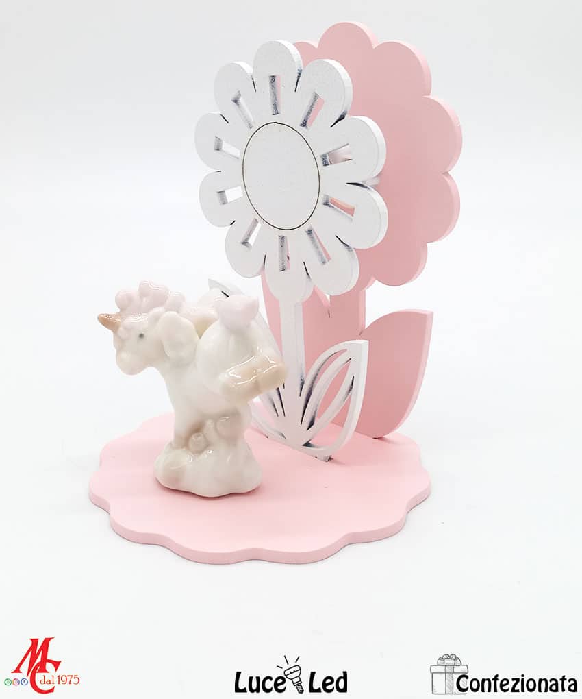 Bomboniera Confezionata – Base Legno Fiore con Unicorno Rosa – Luce Led