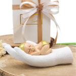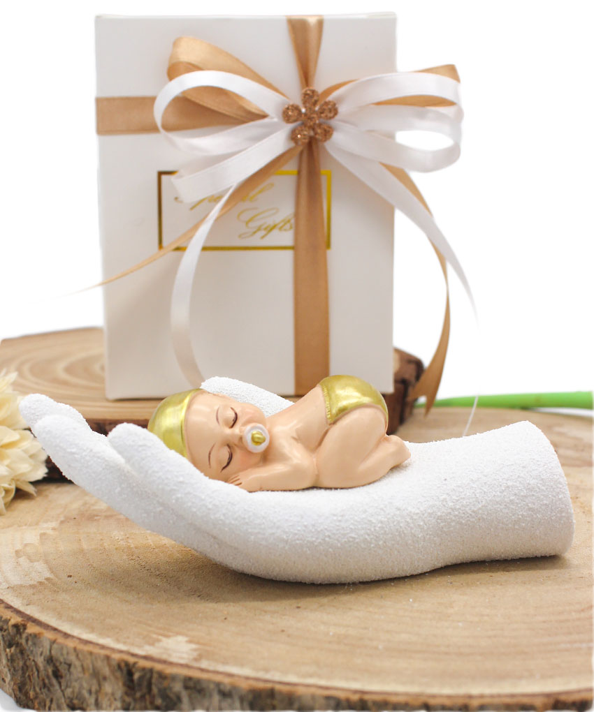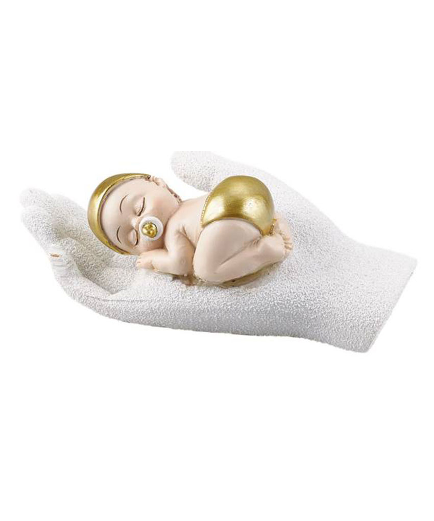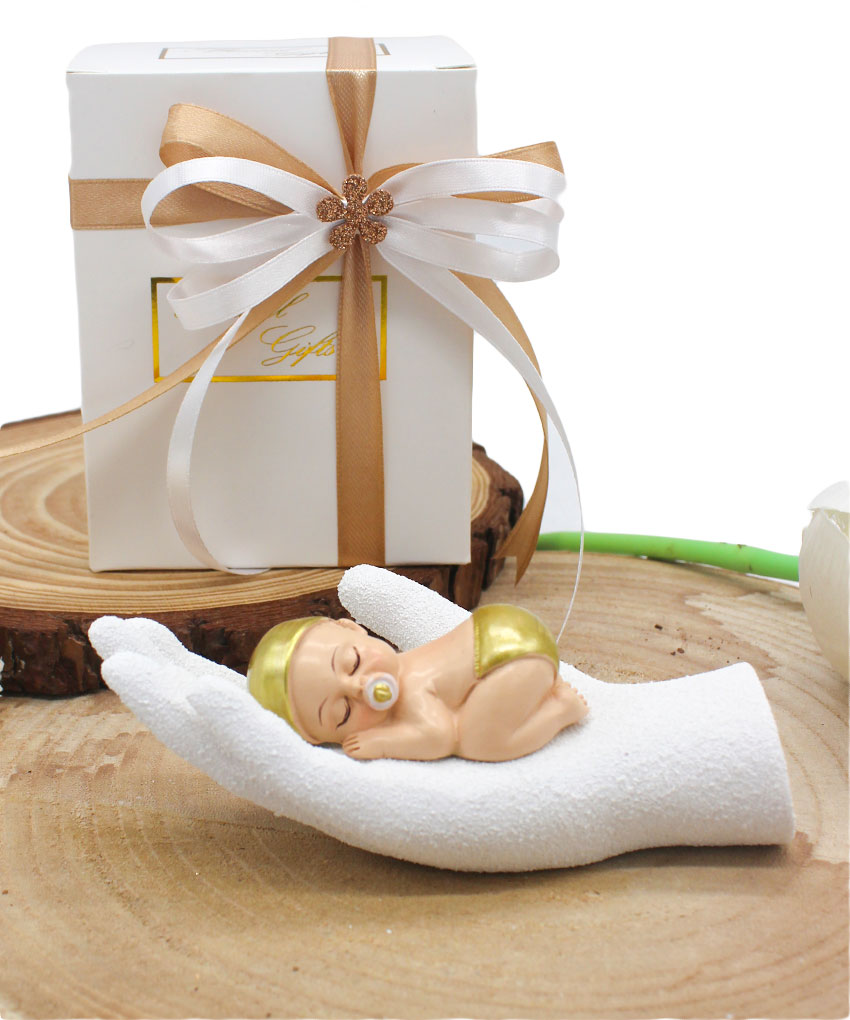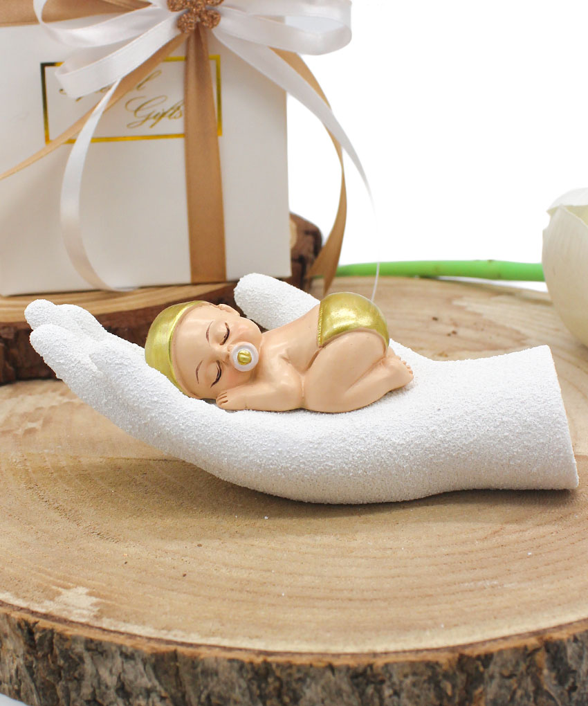 Celebra il battesimo del tuo piccolo con una bomboniera battesimo raffinata e significativa. Questa splendida statuetta in resina raffigura un dolce bimbo adagiato su una mano, simbolo di protezione e amore. Perfetta come ricordo per amici e parenti, questa bomboniera unisce eleganza e significato, rendendo il giorno del battesimo ancora più speciale.