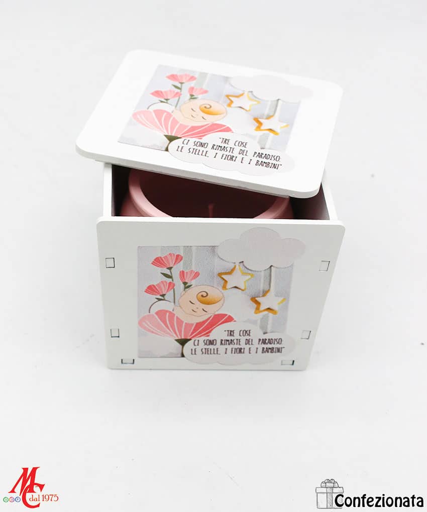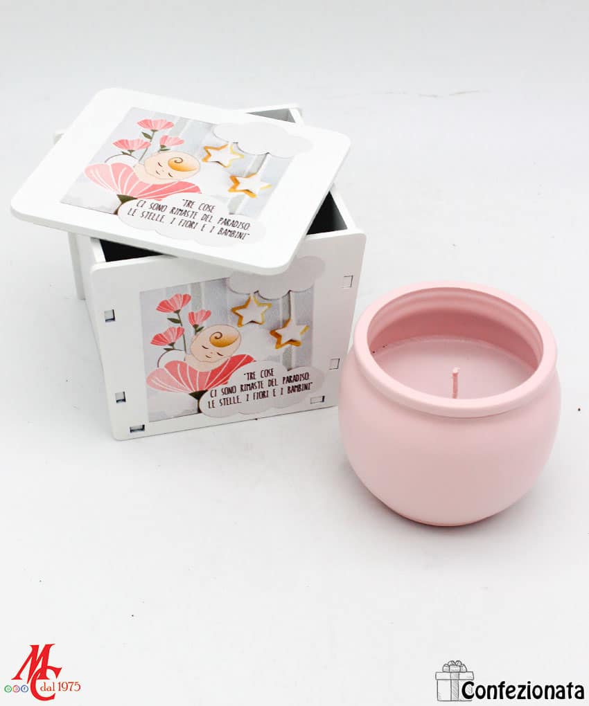 Bomboniera Battesimo Femminuccia: Candela Profumata con Custodia in Legno – Decorazione Abbinata – Completa di Confezione