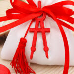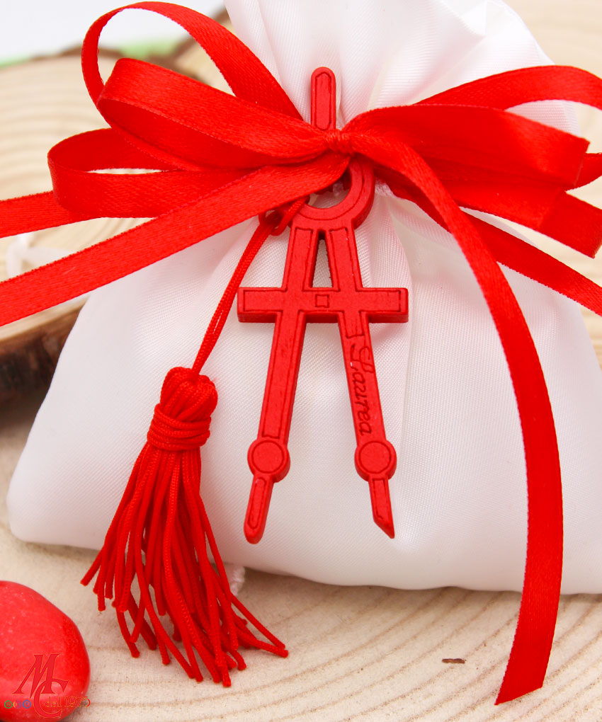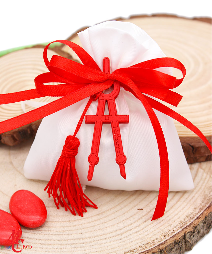 Il sacchettino bianco rappresenta purezza e successo, ed è ornato con un elegante compasso in legno intagliato al laser, simbolo di precisione e professionalità nel campo dell’ingegneria e dell’architettura. La nappina color rosso aggiunge un tocco di vivacità e tradizione.