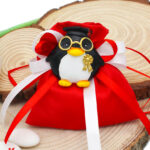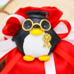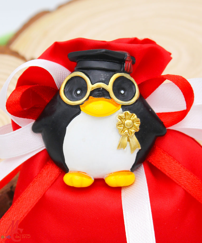 Il sacchettino rosso, simbolo di fortuna e successo, è ornato con un adorabile magnete a forma di pinguino che indossa un cappello da laureato. Questo dettaglio aggiunge un tocco giocoso e unico alla bomboniera, rendendola un perfetto ricordo della tua laurea.