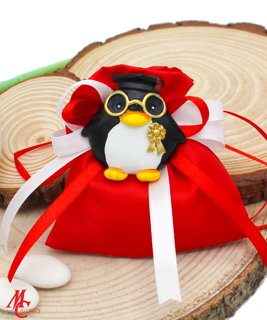 Bomboniera per Laurea: Sacchettino Rosso con Magnete Pinguino Laureato