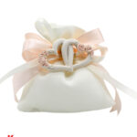 Il sacchettino è realizzato con tessuto pregiato, garantendo una sensazione al tatto piacevole e una presentazione elegante. L’applicazione dei cuori intrecciati con fiori rosa aggiunge un tocco di dolcezza e romanticismo, perfettamente in tema con l’atmosfera nuziale.