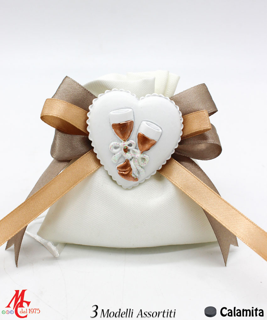 Il sacchettino è realizzato con tessuti pregiati, garantendo una sensazione al tatto lussuosa e una presentazione impeccabile. Le applicazioni dei 3 magneti assortiti in tema matrimonio sono curate nei minimi dettagli, rappresentando simboli di amore, unione e felicità. Questo design versatile si adatta perfettamente a qualsiasi stile di matrimonio, dal classico al moderno.