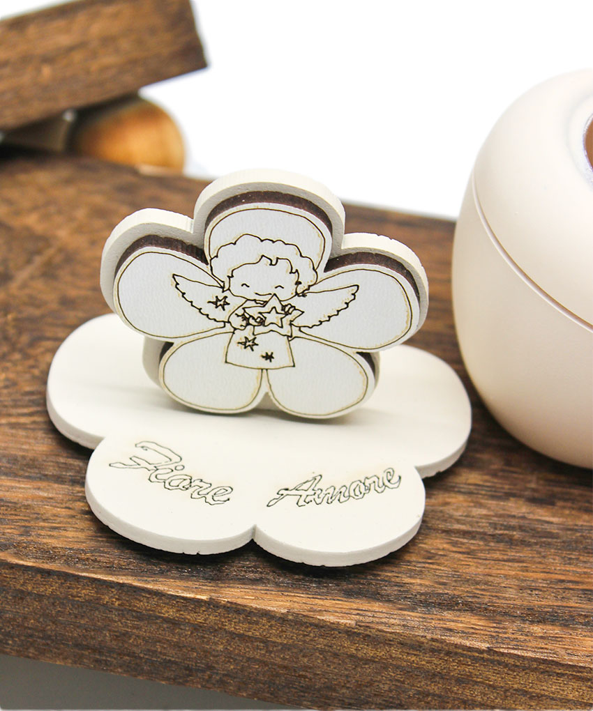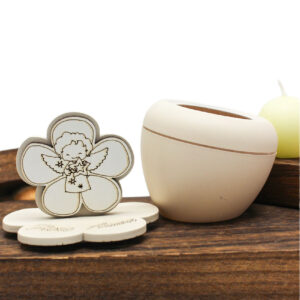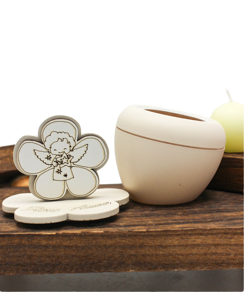 Il simbolo dell’angioletto, emblema di protezione, purezza e augurio, dona a questa candela un forte valore simbolico, mentre il design sobrio e armonioso la rende adatta a qualsiasi stile di allestimento. Il contenitore valorizza l’oggetto rendendolo decorativo e funzionale, perfetto come ricordo da conservare nel tempo.