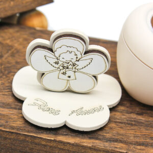 Grazie alle dimensioni di 7 × 9 cm, questa bomboniera si presenta compatta ma elegante, ideale da esporre negli ambienti domestici come memoria di un giorno speciale.