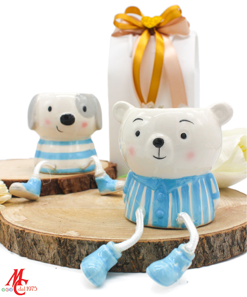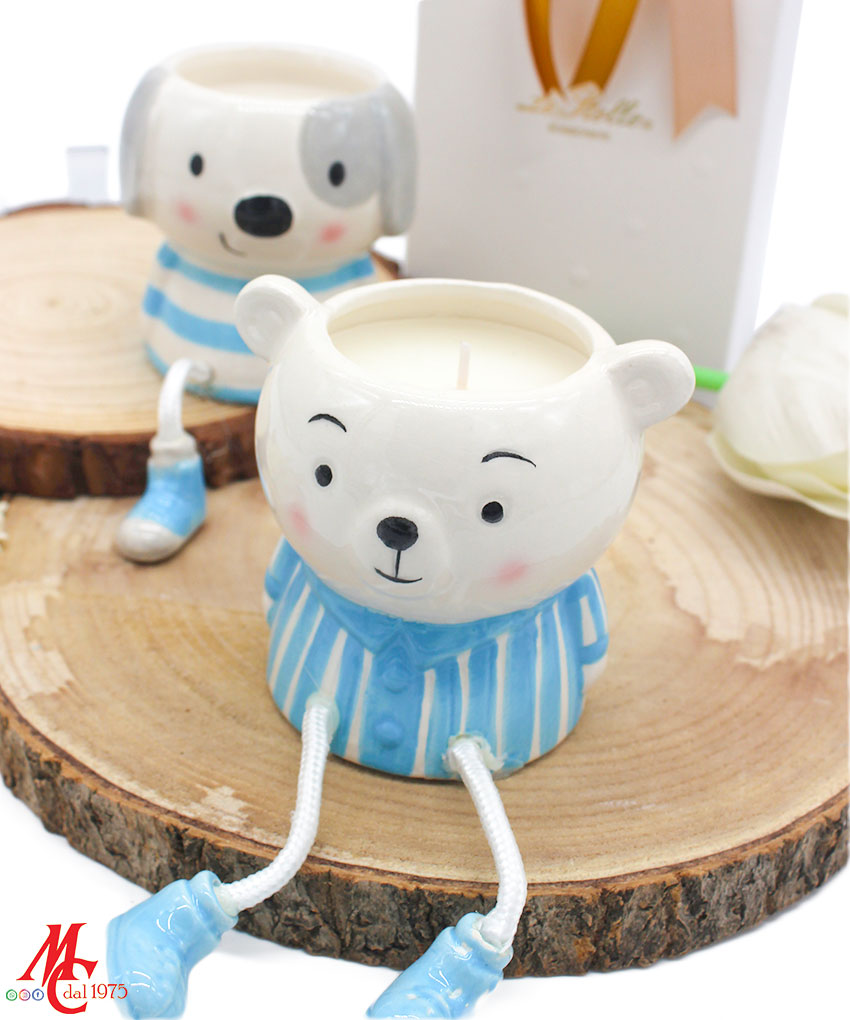 Questa candela in porcellana celeste è disponibile in 2 modelli assortiti: cagnolino e orsetto, entrambi curati nei minimi dettagli e confezionati singolarmente per un effetto sorpresa garantito.