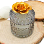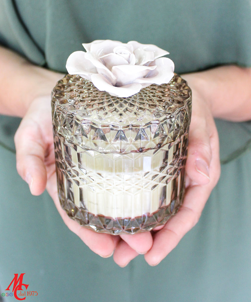 Il contenitore in vetro di colore Nero è sormontato da un elegante fiore in porcellana di colore oro, aggiungendo un elemento di lusso e distinzione. Le dimensioni di 9×11,5 cm rendono questa bomboniera un elemento decorativo perfetto per qualsiasi ambiente, combinando funzionalità e bellezza estetica.