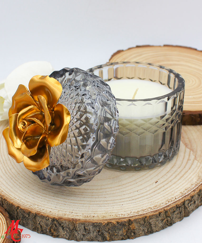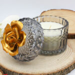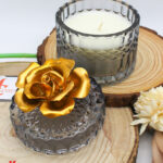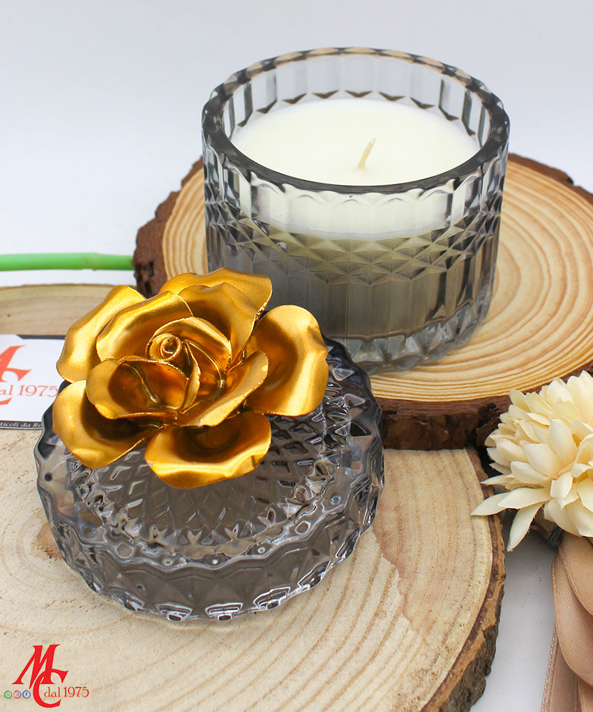 Bomboniera Candela con Contenitore in Vetro Nero e Fiore in Porcellana Oro