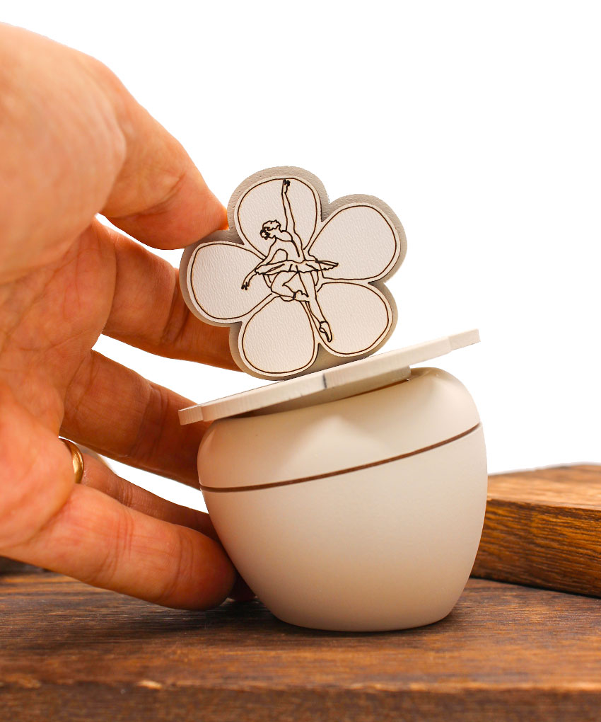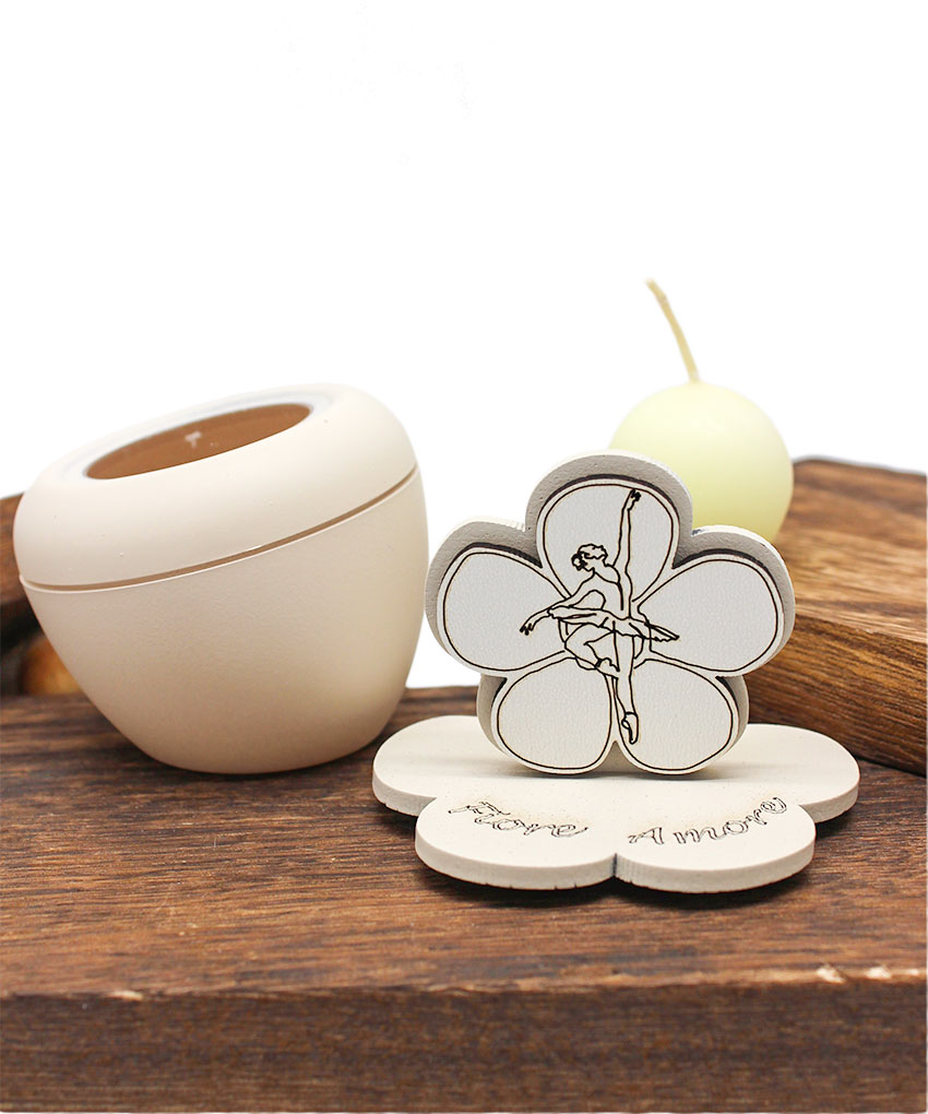 Candela con coperchio decorato Ballerina colore sabbia. Bomboniera elegante e simbolica. Misure 7 × 9 cm.
