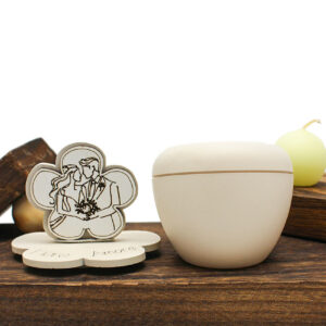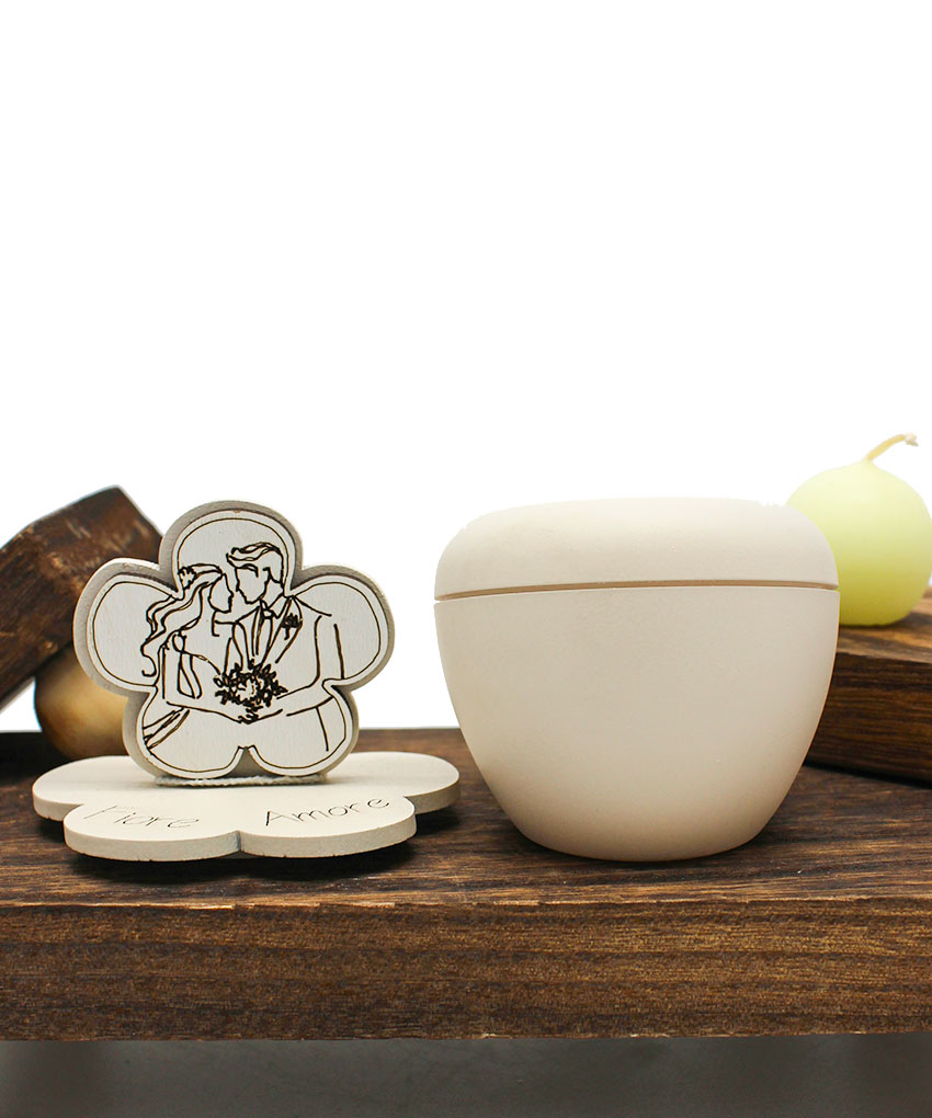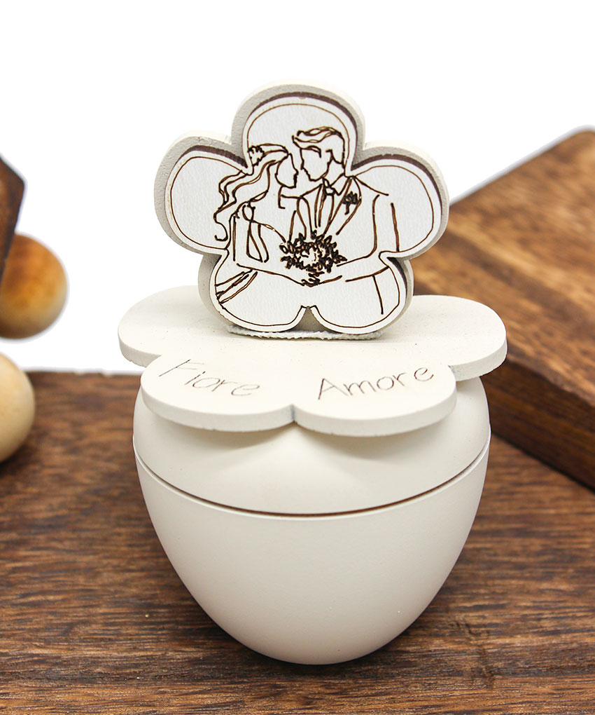 La Bomboniera Candela con contenitore e coperchio decorato con simbolo coppia sposi è una proposta elegante e ricca di significato, ideale per celebrare matrimoni, anniversari e ricorrenze romantiche con uno stile raffinato e senza tempo.