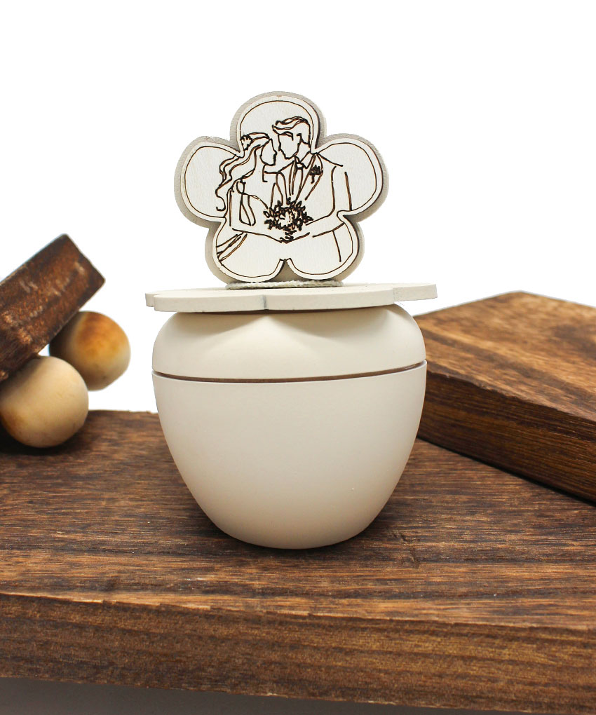 La candela è racchiusa in un contenitore curato nei dettagli, impreziosito dal simbolo della coppia di sposi, emblema di amore, unione e condivisione. Il coperchio coordinato completa il design, rendendo la bomboniera non solo decorativa ma anche funzionale.