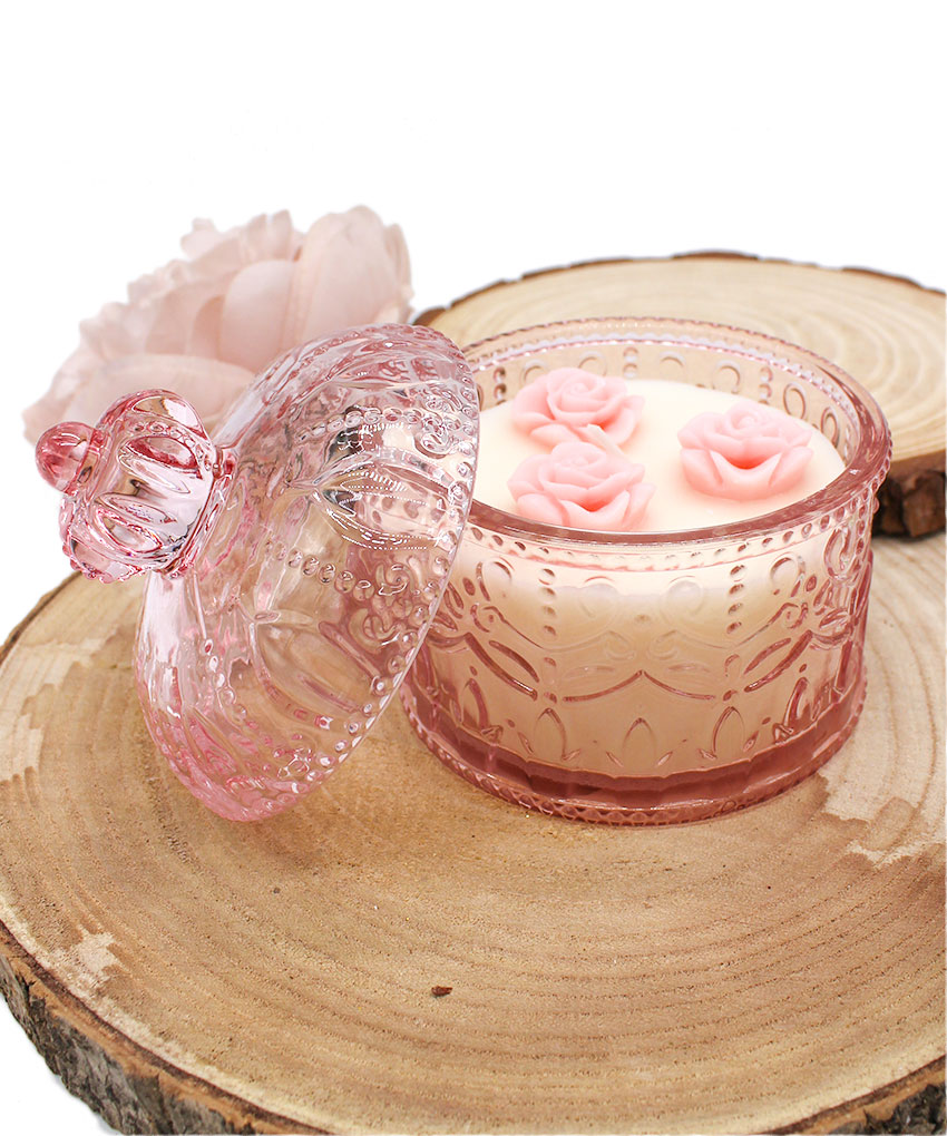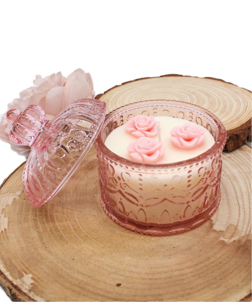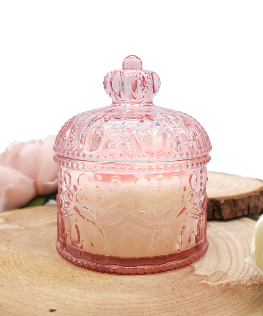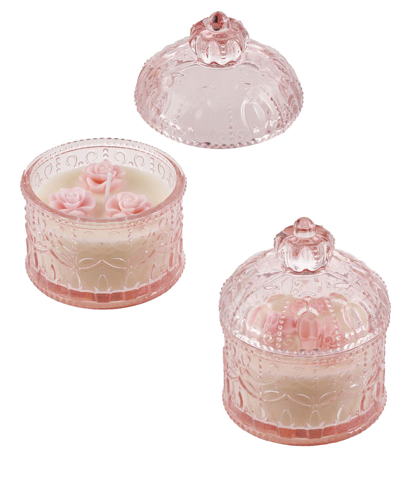 Bomboniera Candela in Vetro Rosa con Coperchio e Fiorellini ️