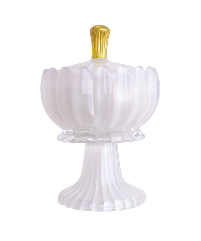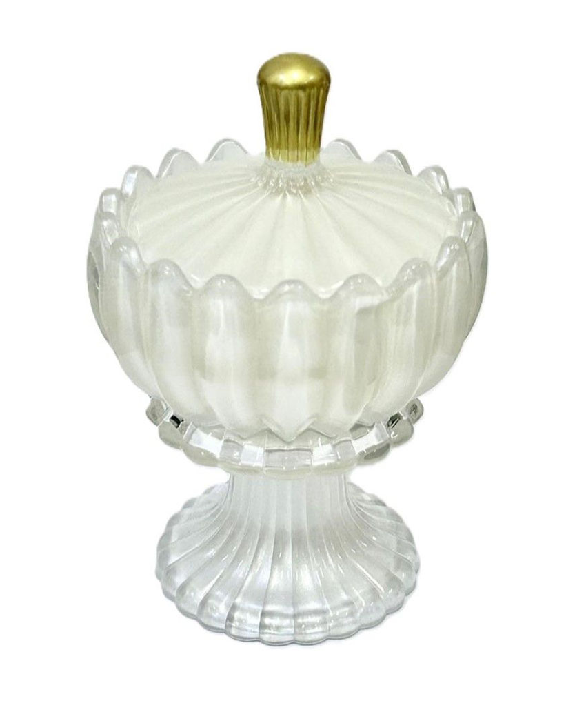 Contenitore in vetro con base ad alzatina e coperchio decorato, dal design sofisticato.