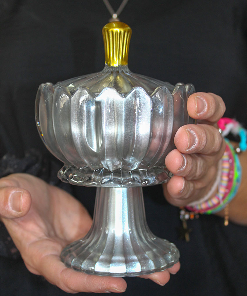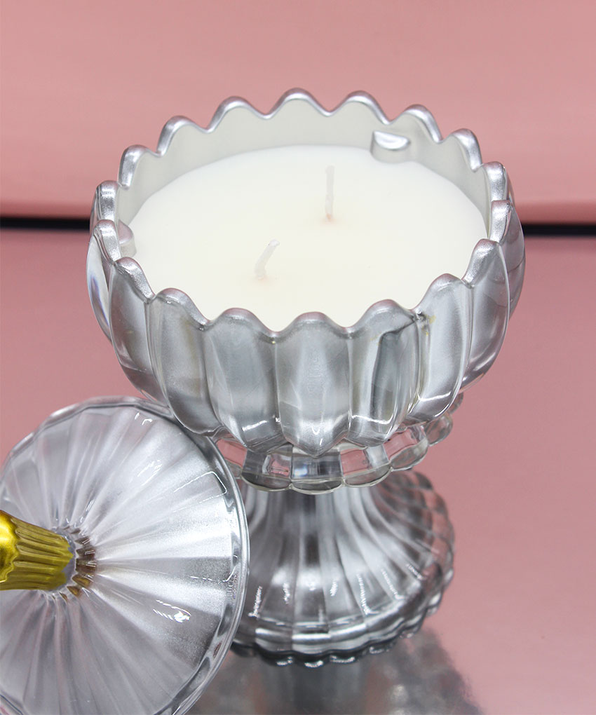 Contenuto: Candela profumata in contenitore di vetro con base ad alzatina e coperchio decorato