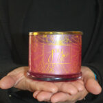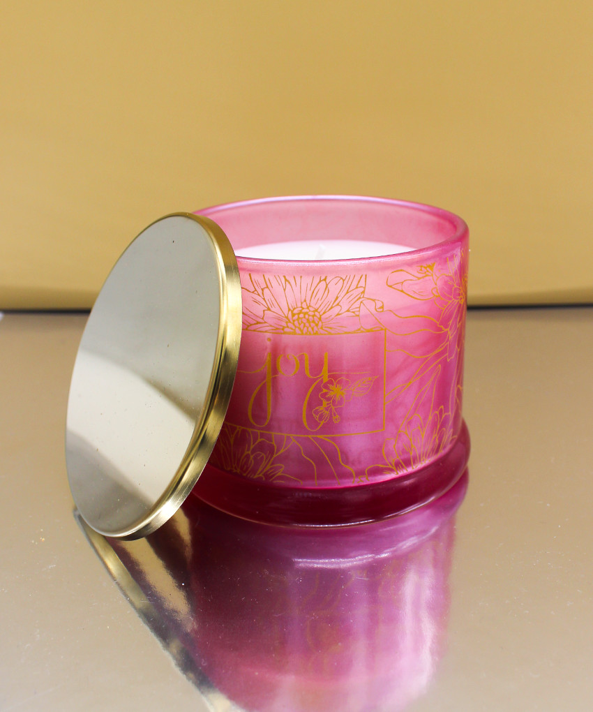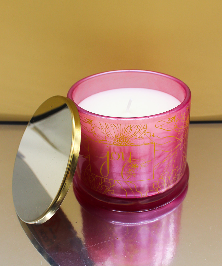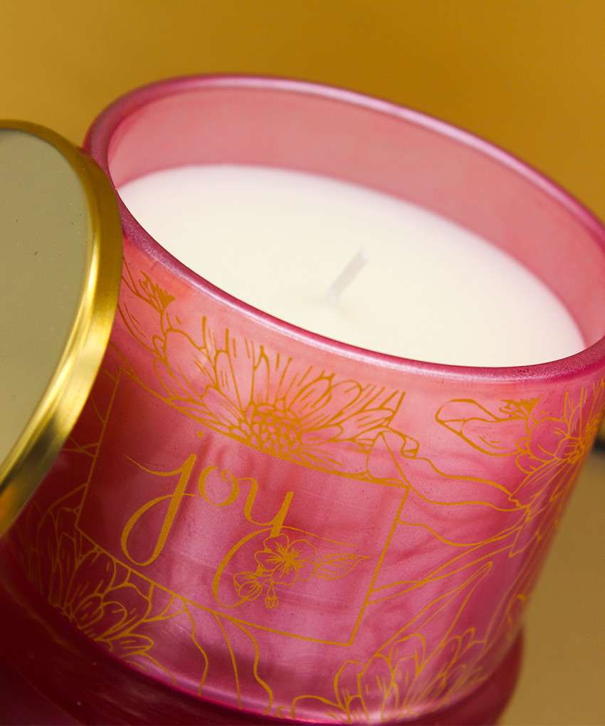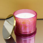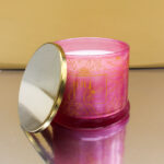 Bomboniera Candela Profumata con Contenitore in Vetro Rosa e Coperchio Oro