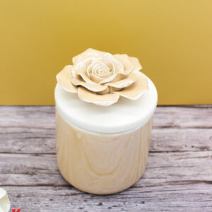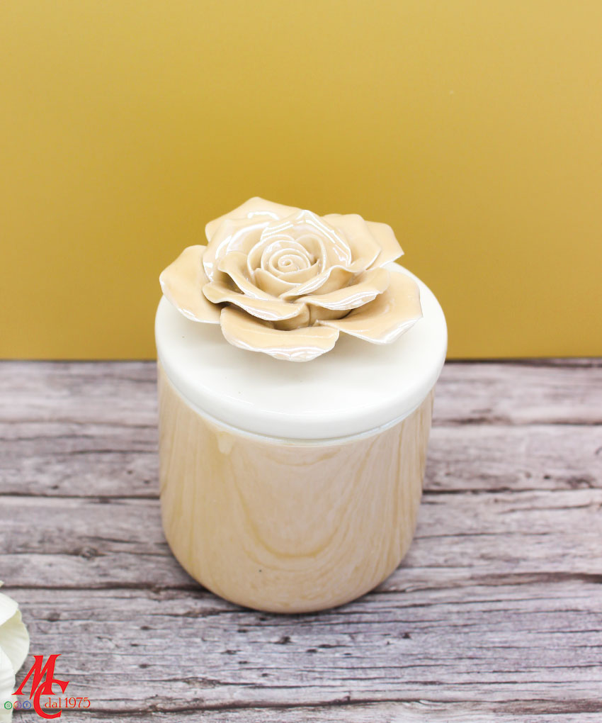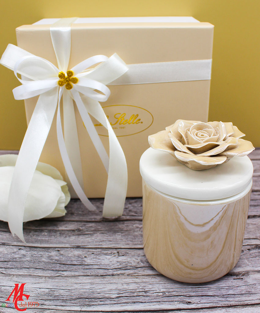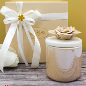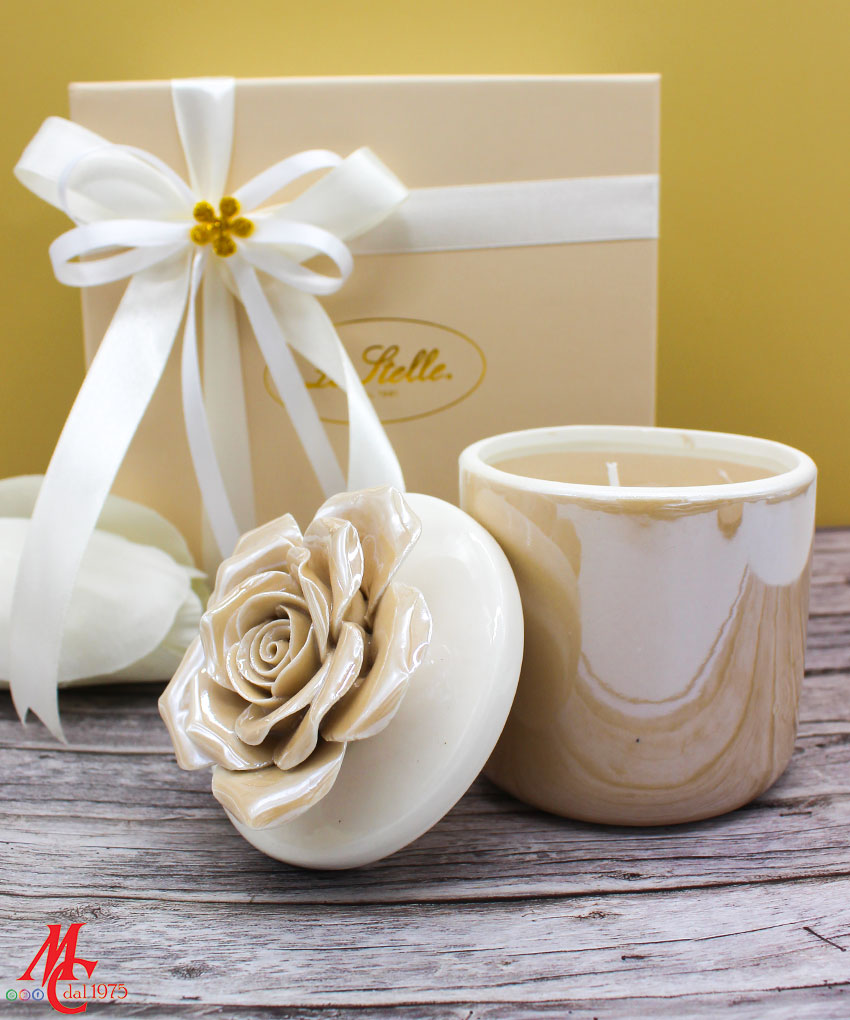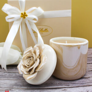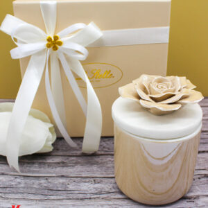Un tocco di luce e raffinatezza in un unico oggetto: la candela racchiusa in una scatola di porcellana beige, con decoro floreale sul coperchio, è l’idea perfetta per una bomboniera elegante e ricercata.
