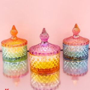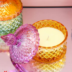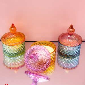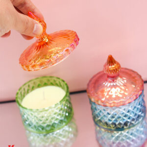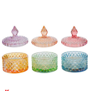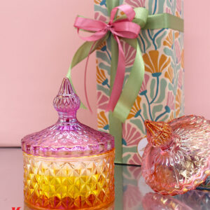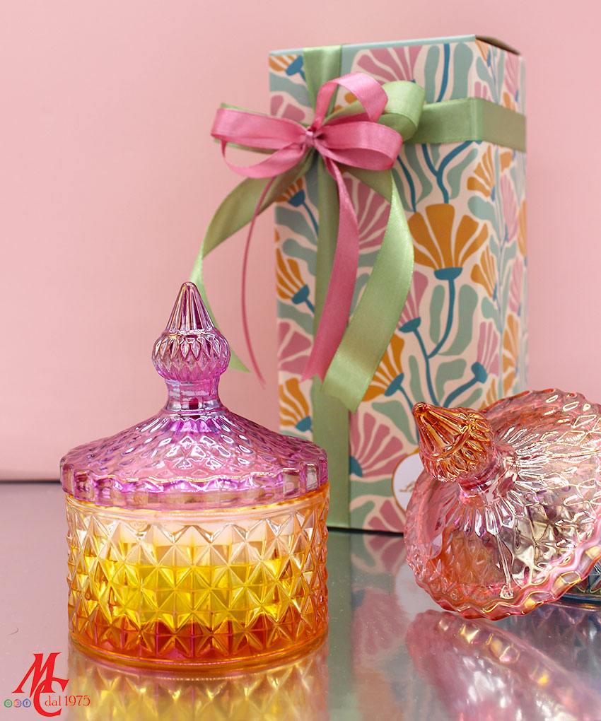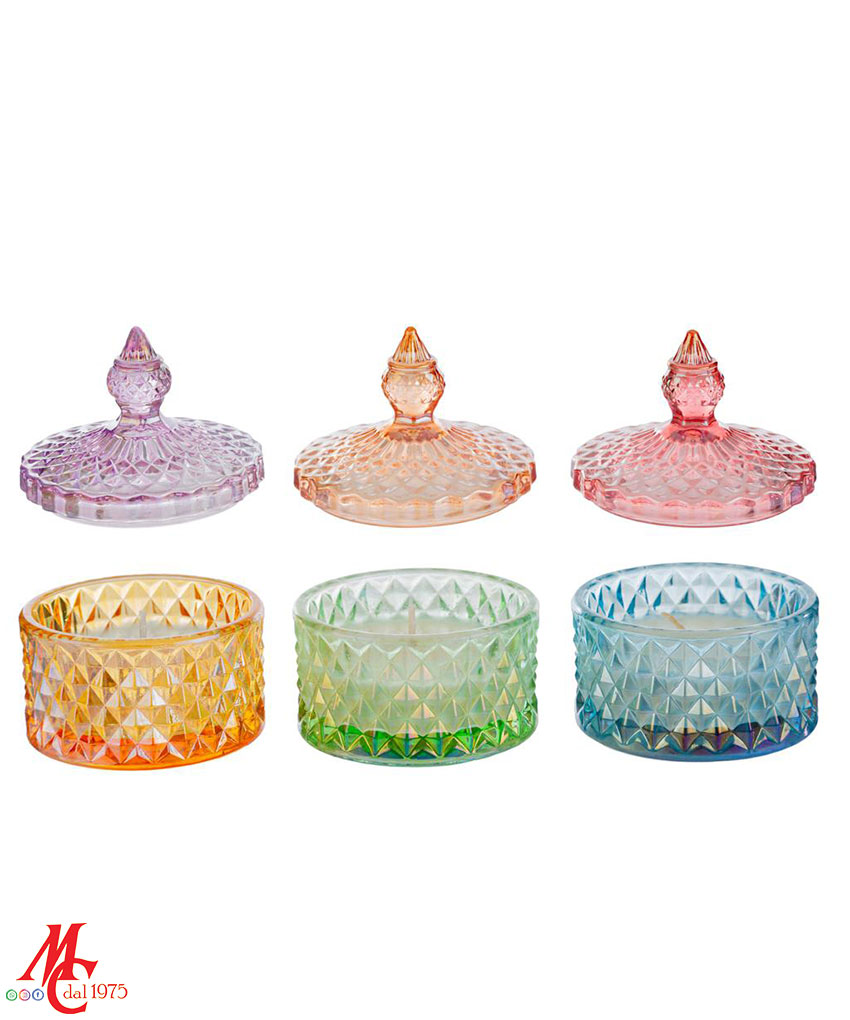 Eleganza, colore e profumo si fondono in una bomboniera che non passa inosservata. Le candele di soia sono contenute in eleganti scatole di vetro colorato lavorato, disponibili in tre tonalità assortite, ideali per illuminare ogni ambiente con stile.