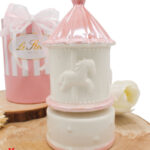 Un ricordo raffinato e senza tempo per celebrare i momenti più teneri. Questo carillon a forma di giostrina, firmato Le Stelle, è realizzato in porcellana rosa ed è perfetto come bomboniera per una nascita o un battesimo.
