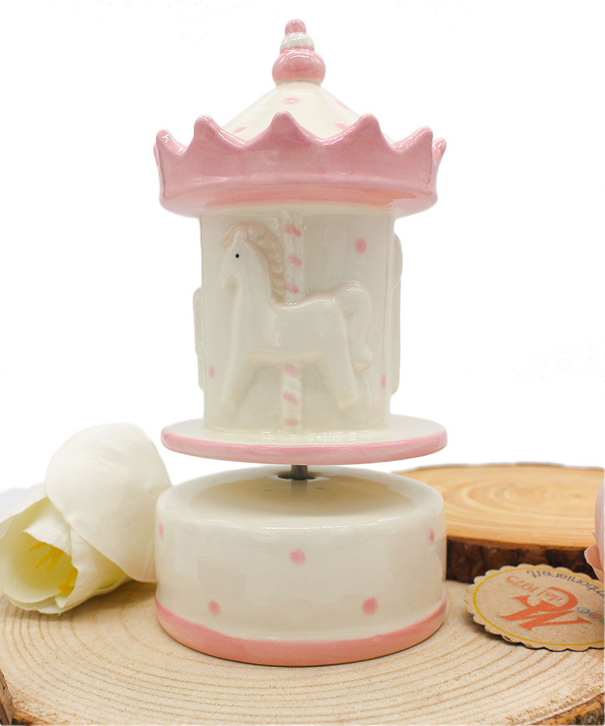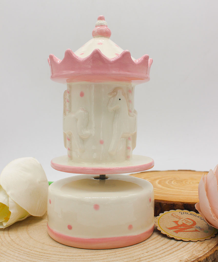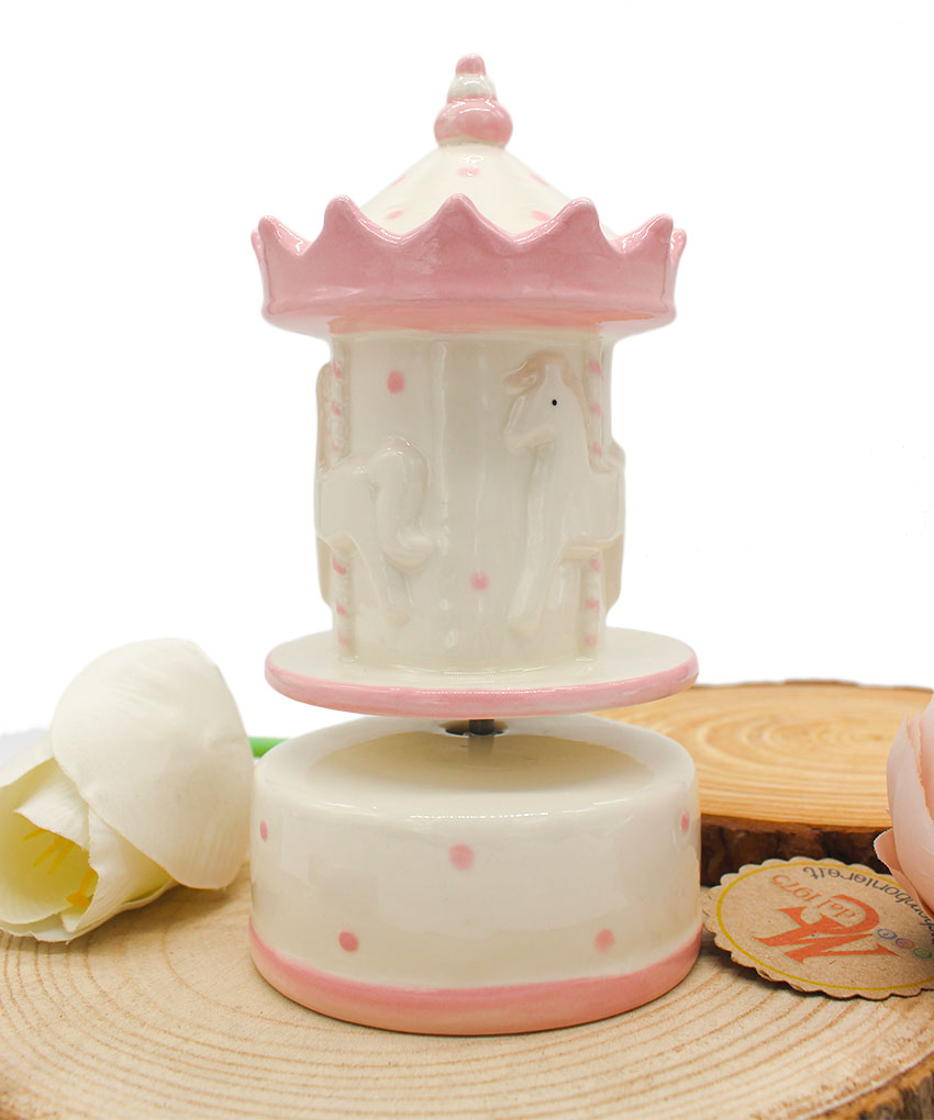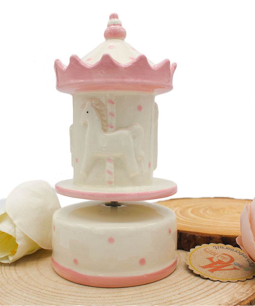 Realizzata in porcellana finemente decorata, presenta una graziosa giostrina che ruota dolcemente accompagnata da una melodia classica, rendendola ideale anche come decorazione per la cameretta.