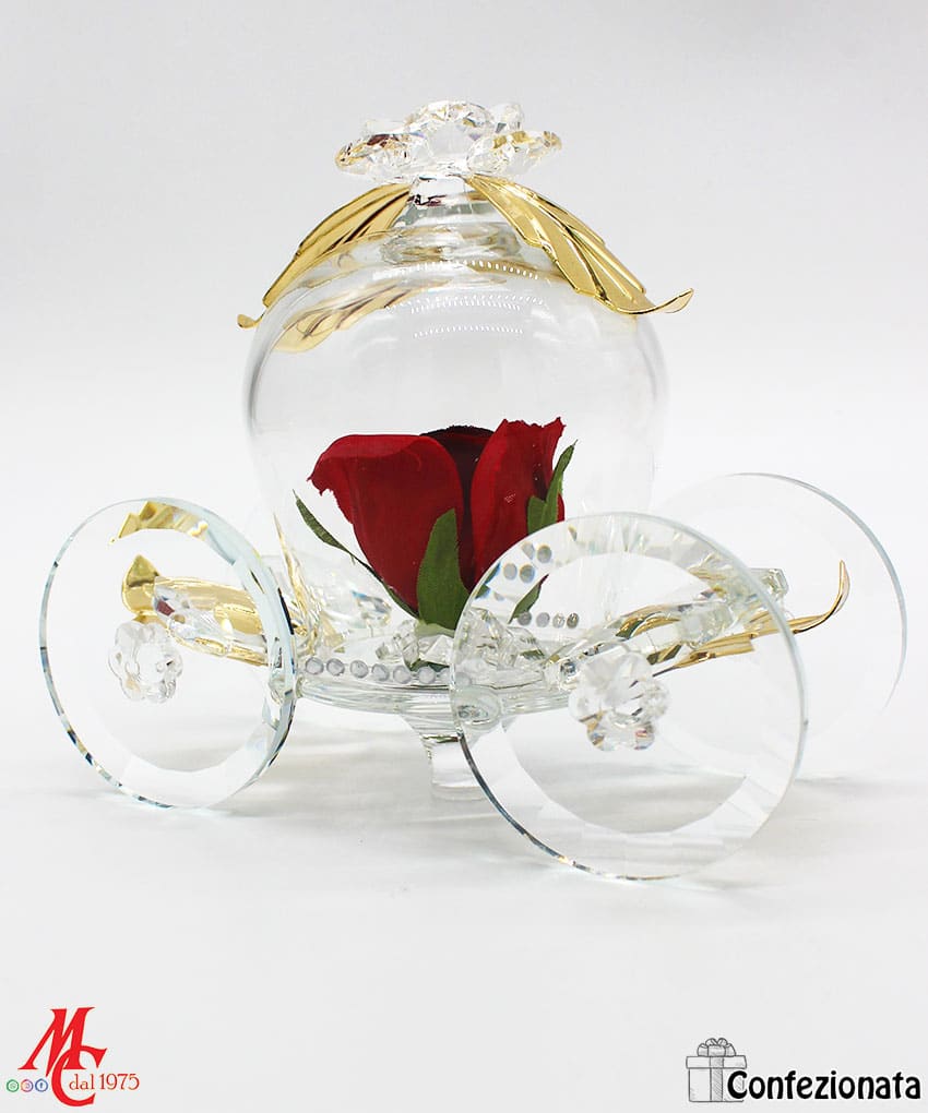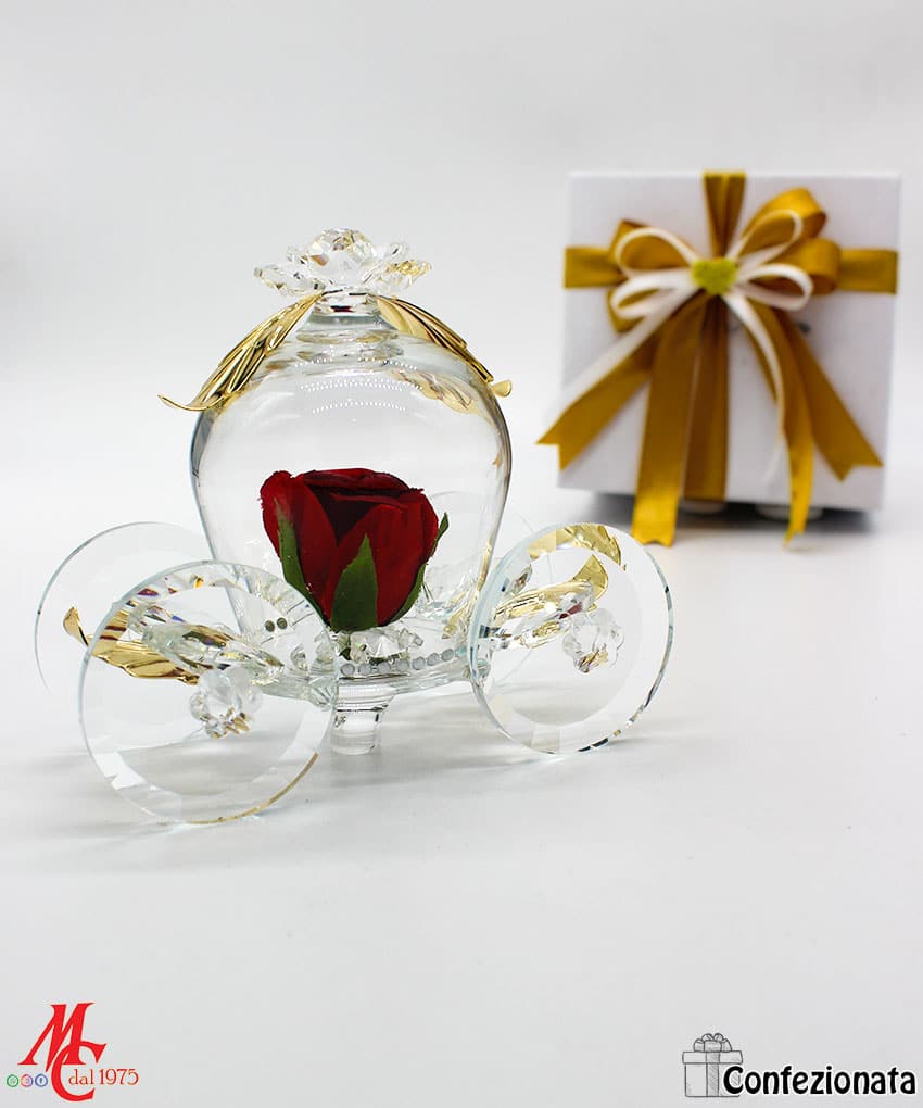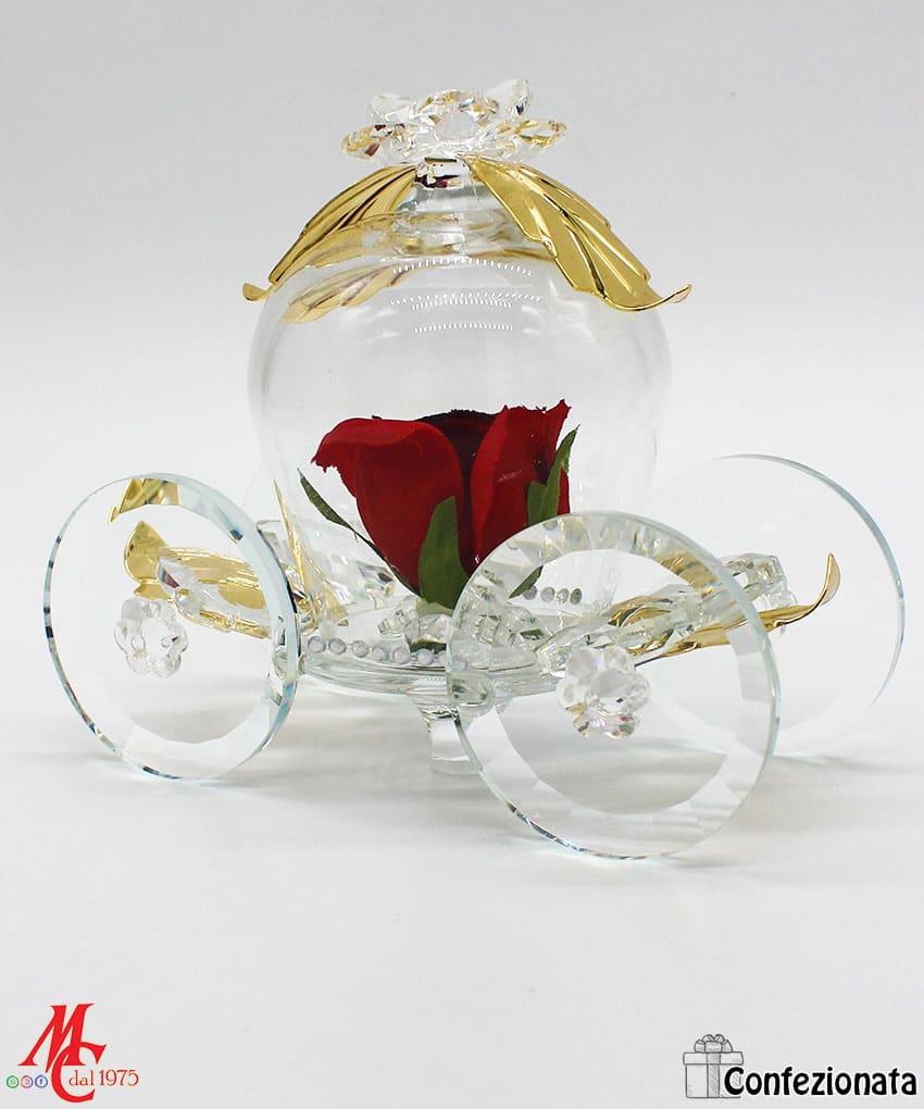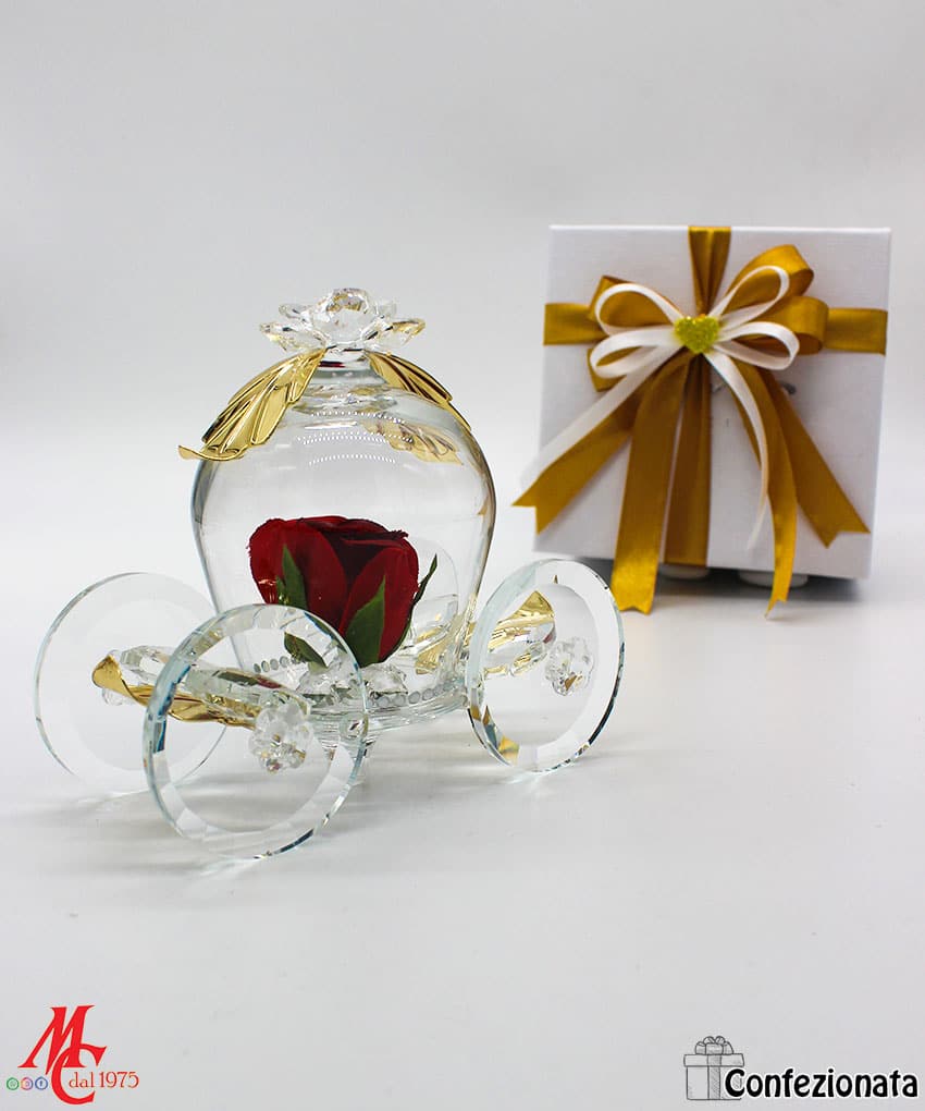 Bomboniera Confezionata – Carrozza Cristallo – Rosa Rossa e Foglie Oro