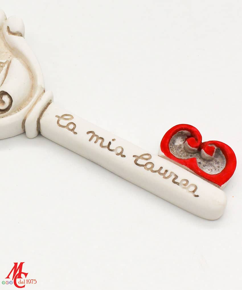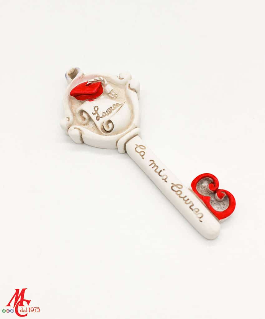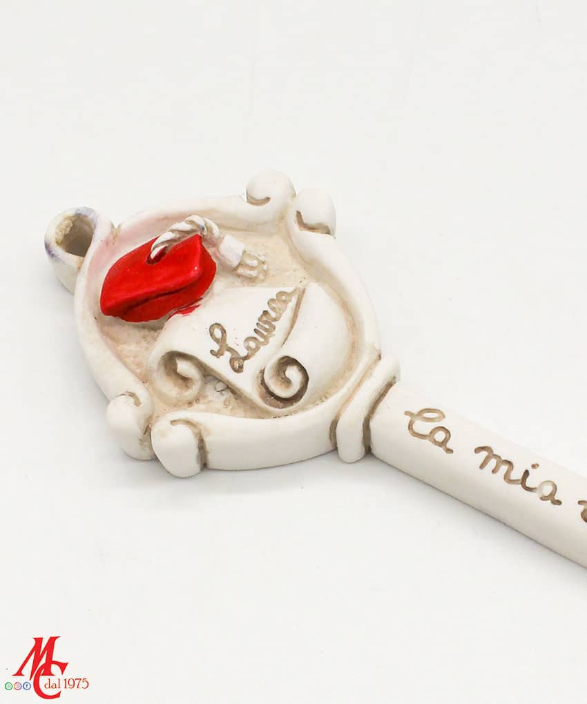 Bomboniera Chiave Laurea – Polvere di Marmo, Colore Bianco e Rosso, Misure 12×5 cm
