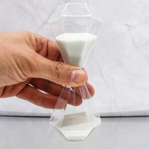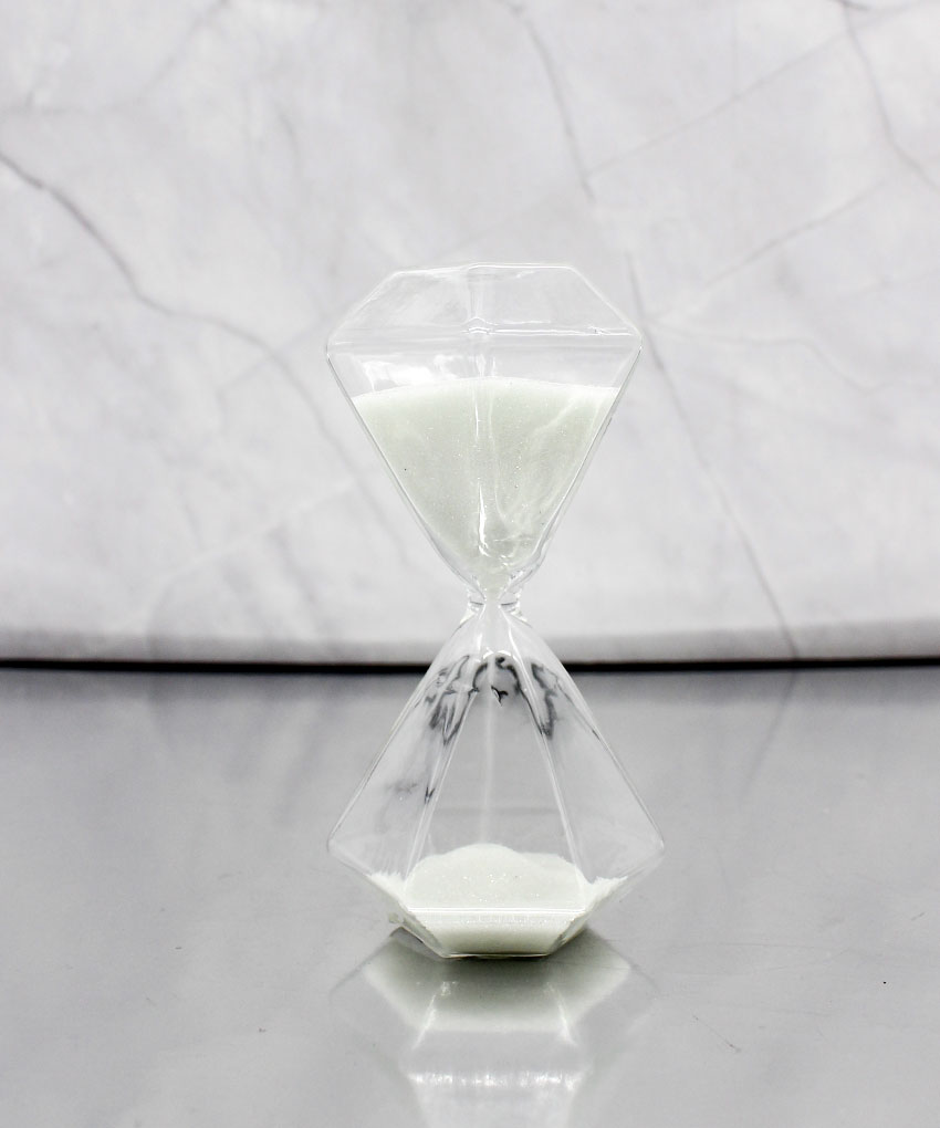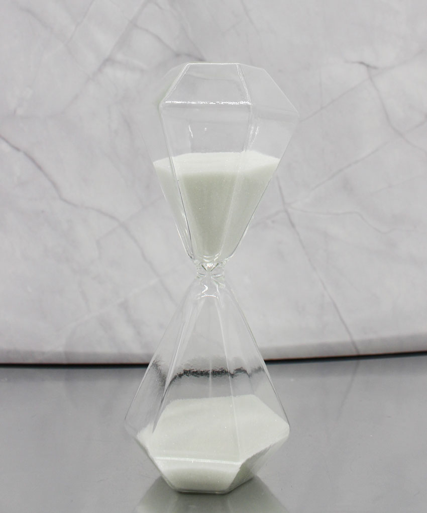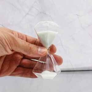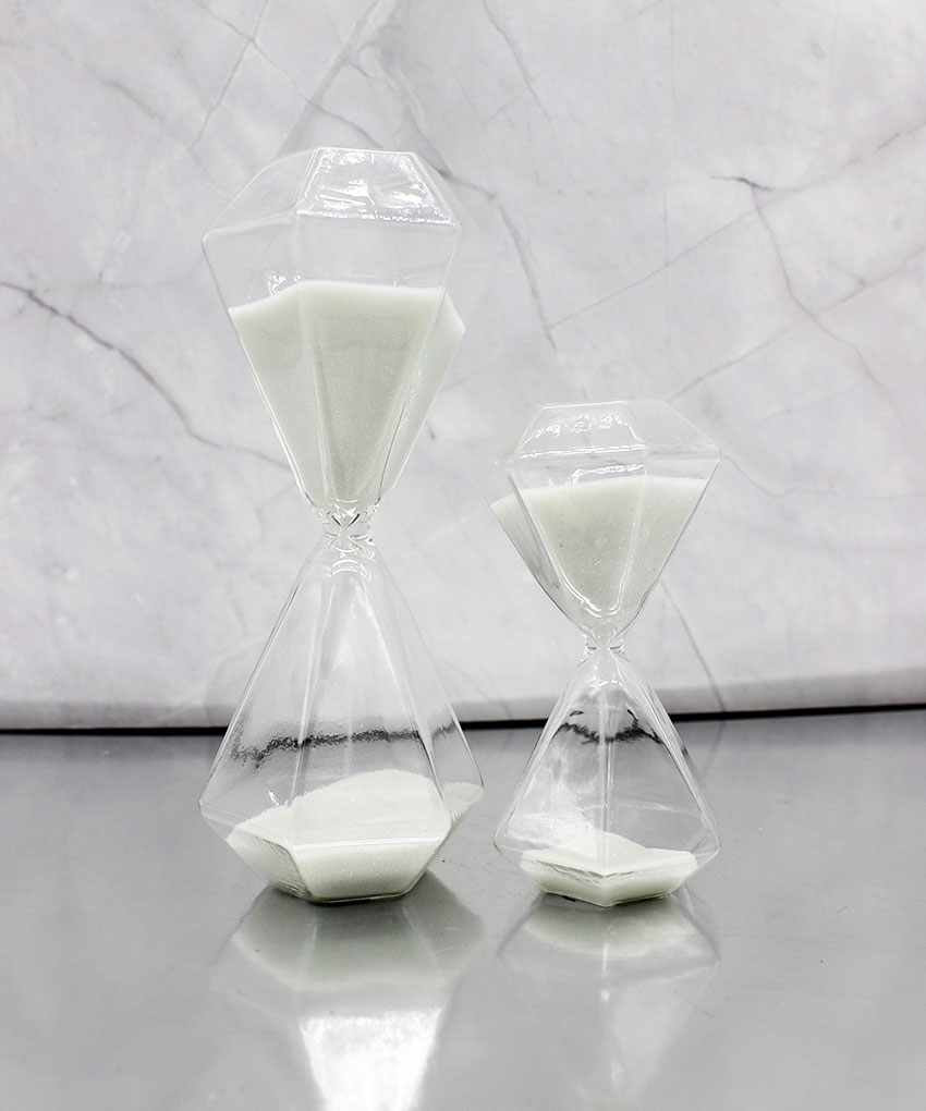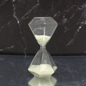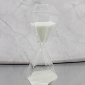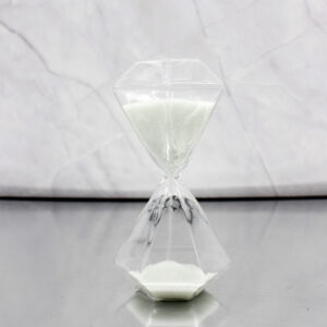 Realizzata in vetro con sabbia bianca, questa clessidra si distingue per la sua particolare forma ottagonale effetto diamante, che riflette la luce creando un effetto luminoso e sofisticato.