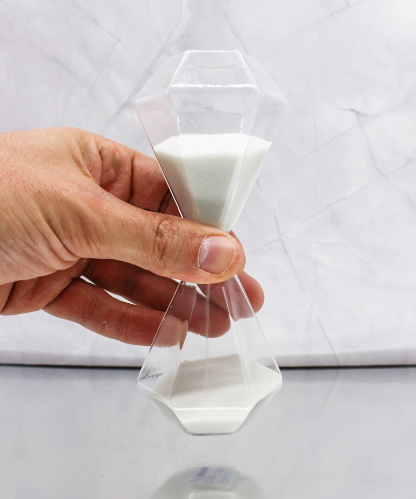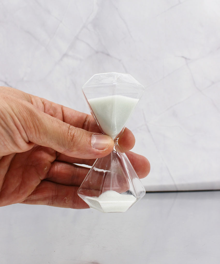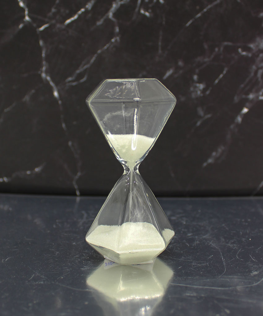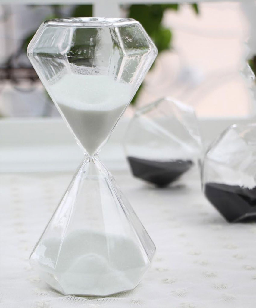 Realizzata in vetro con sabbia bianca, questa clessidra si distingue per la sua particolare forma ottagonale effetto diamante, che riflette la luce creando un effetto luminoso e sofisticato.