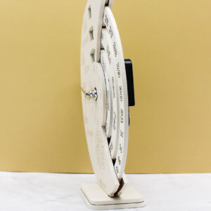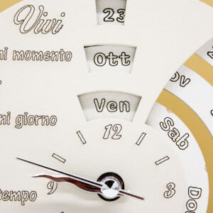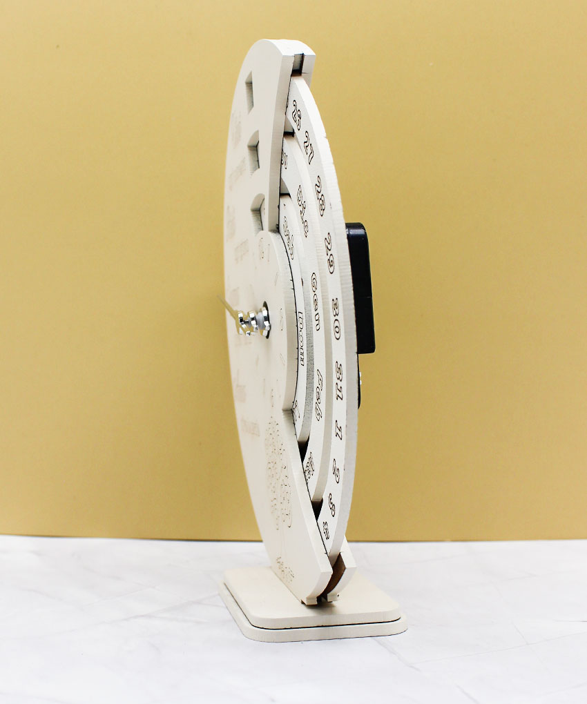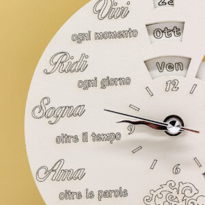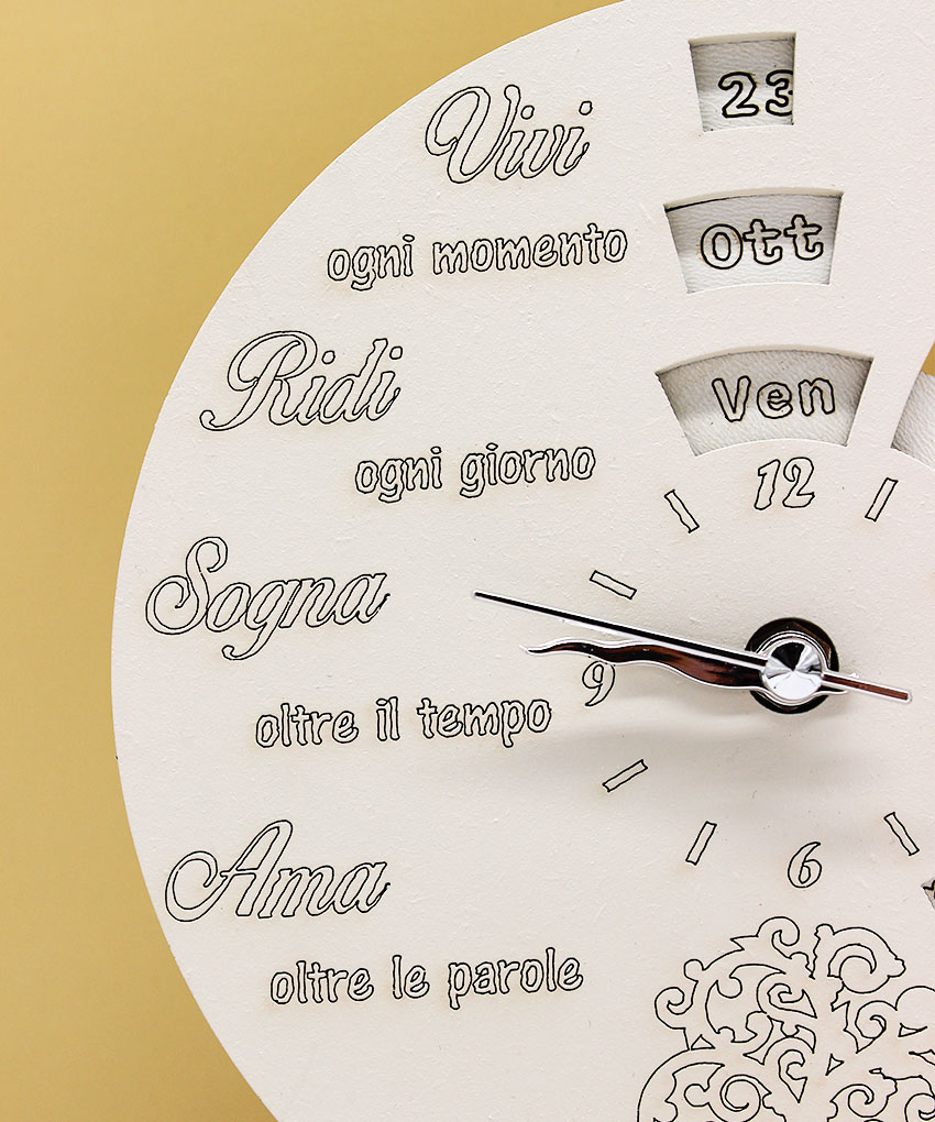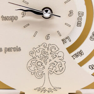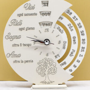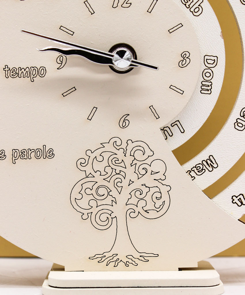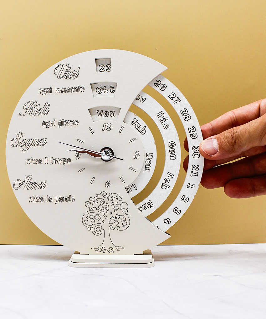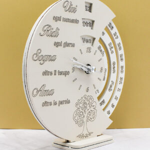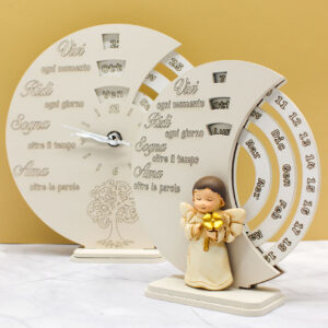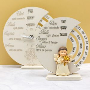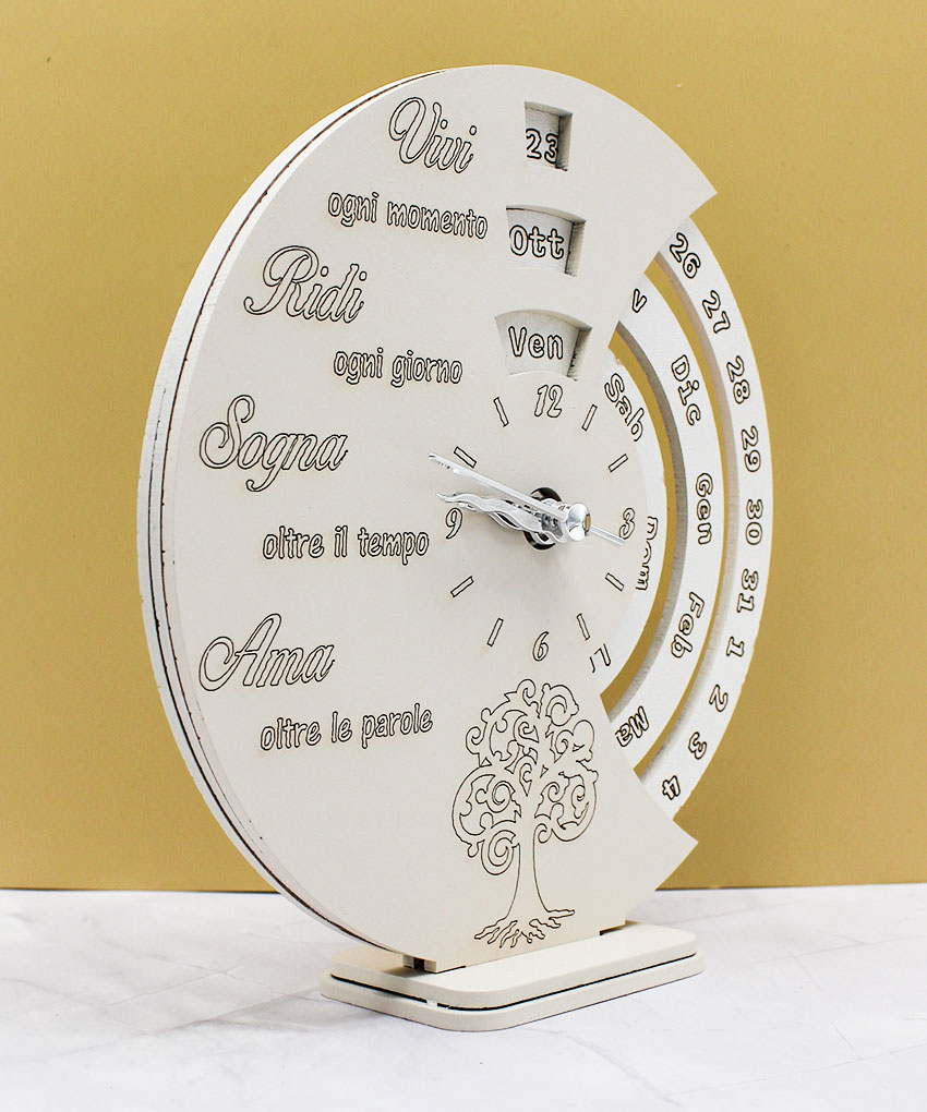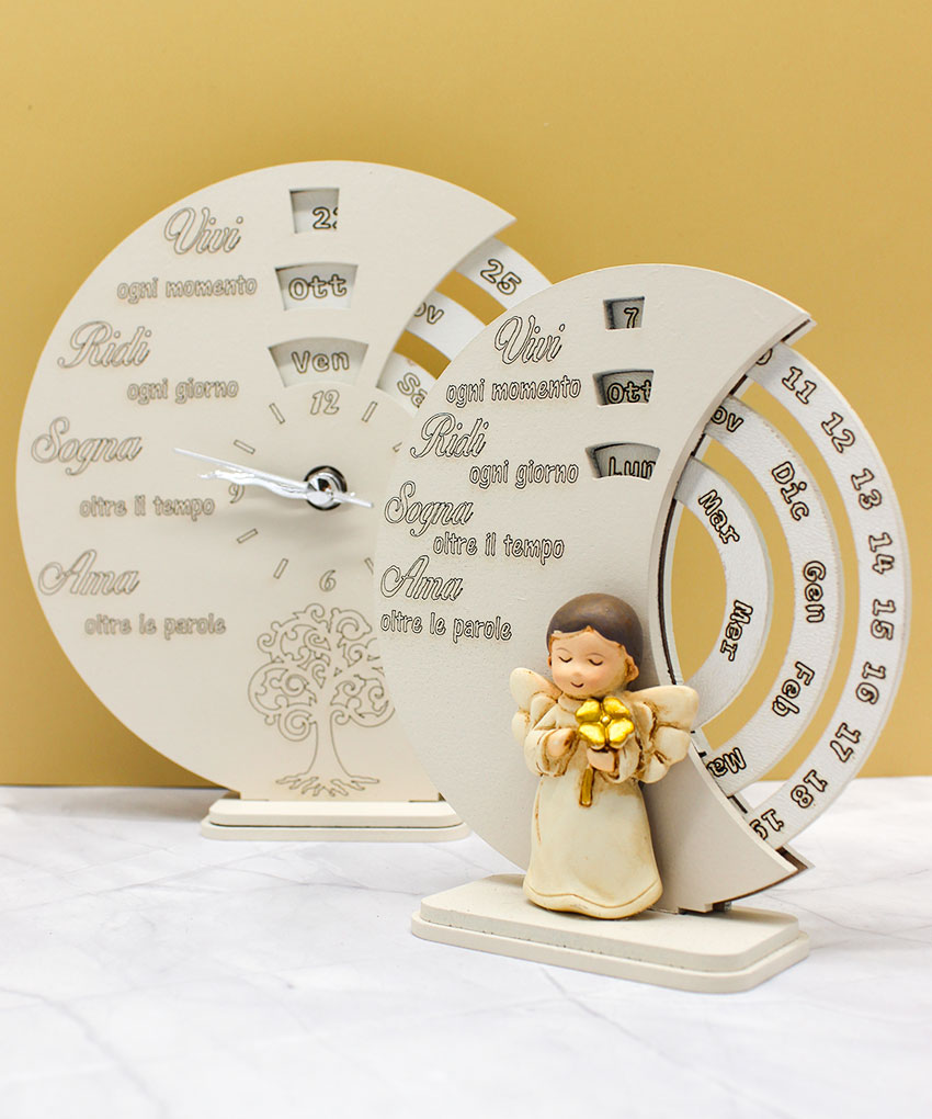 Realizzato in legno intagliato al laser, si distingue per la precisione delle lavorazioni e per la raffinata finitura color sabbia, una tonalità calda e delicata che si adatta armoniosamente a qualsiasi ambiente domestico. Le dimensioni di 16 × 17 cm lo rendono un complemento d’arredo equilibrato e decorativo, capace di unire valore simbolico e funzionalità grazie al pratico datario da tavolo.