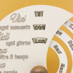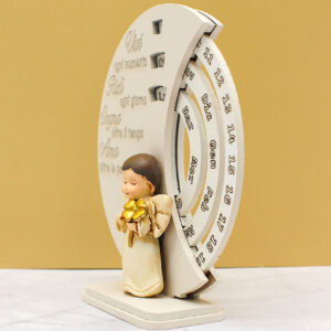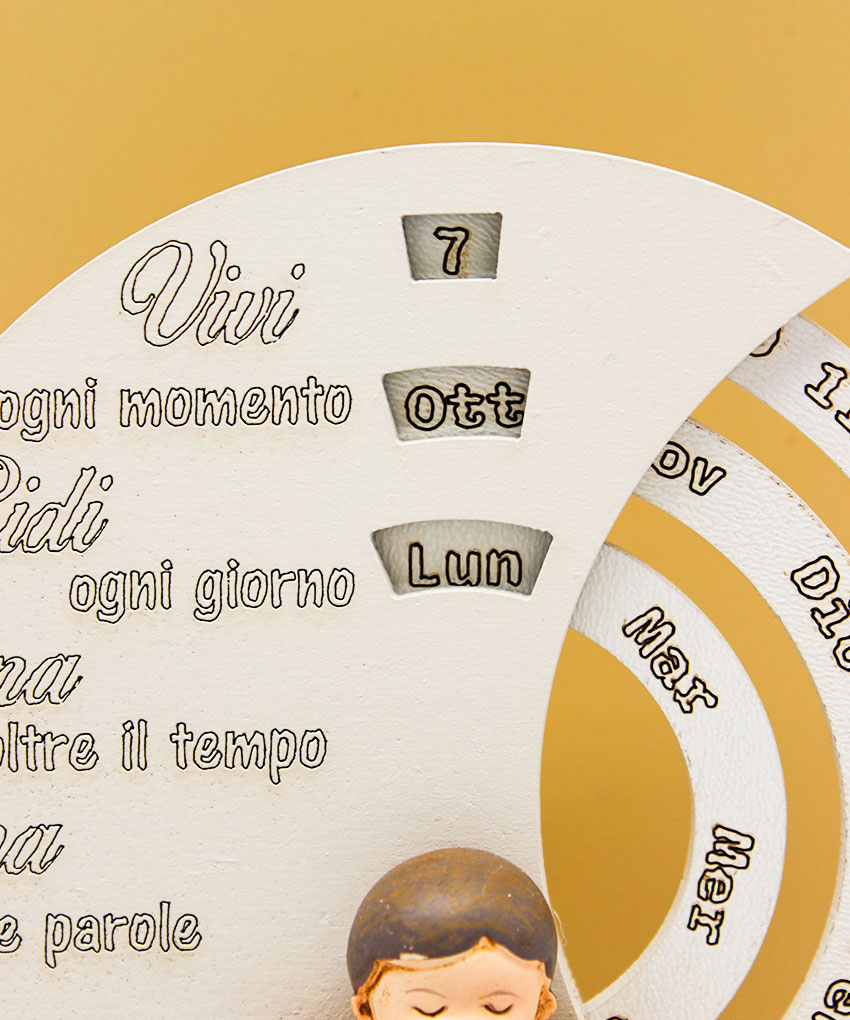 Realizzato in legno intagliato al laser, si distingue per la cura dei dettagli e per la raffinata finitura color sabbia, una tonalità calda e luminosa che si armonizza facilmente con qualsiasi stile d’arredo. Le dimensioni compatte di 12 × 12 cm lo rendono un complemento decorativo discreto ma significativo, capace di unire valore simbolico e funzionalità grazie al pratico datario da tavolo.