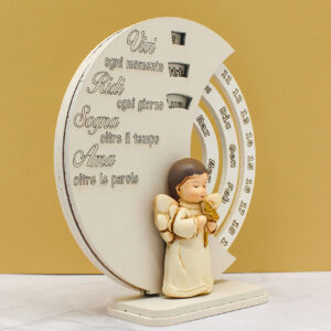Datario da tavolo con angioletto e frase romantica in legno intagliato, colore sabbia. Bomboniera elegante e simbolica. Dimensioni 12 × 12 cm.