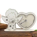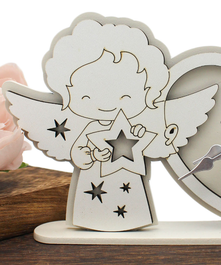 Cerchi una bomboniera simbolica, tenera ed economica? Questo bomboniera economica orologio angioletto con stelle, in legno intagliato al laser, è la scelta perfetta per chi desidera donare un pensiero che trasmetta dolcezza, protezione e spiritualità.