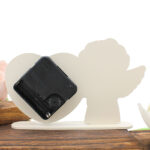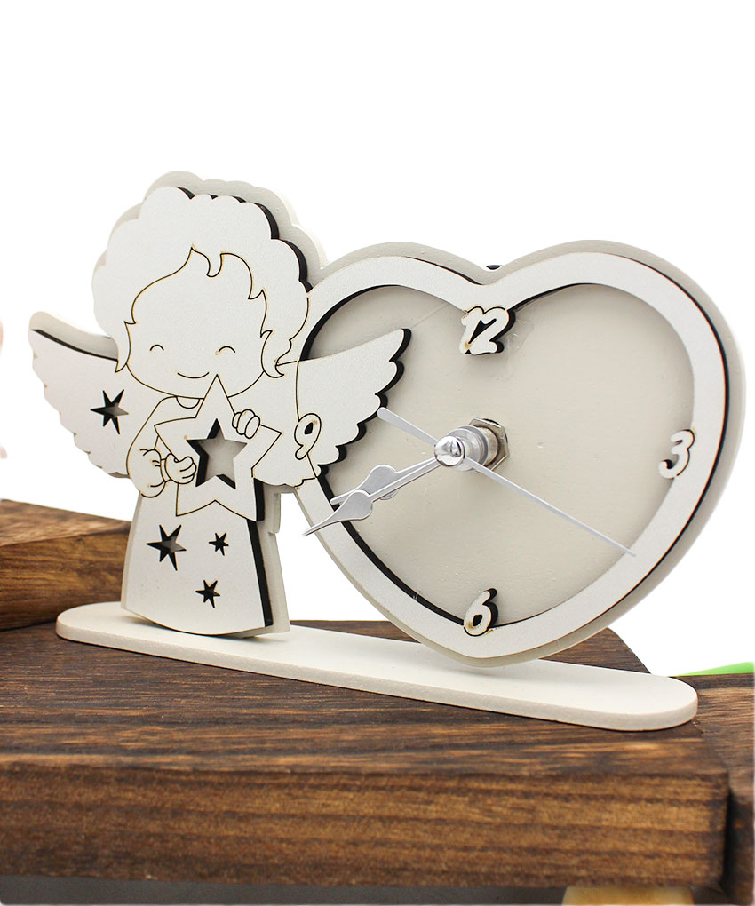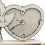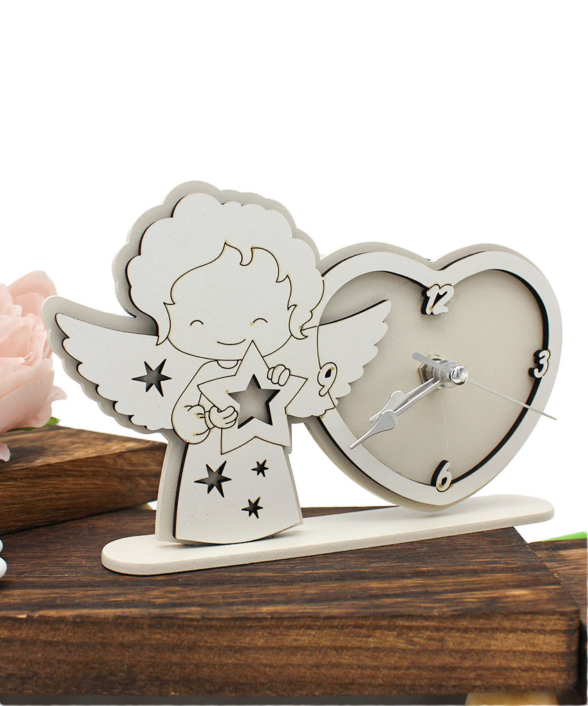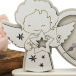 Tipologia: Orologio decorativo da appoggio o da parete – Forma: Angioletto con stelle – Colore: Beige – Materiale: Legno intagliato al laser – Misure: 17 × 11 cm