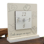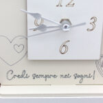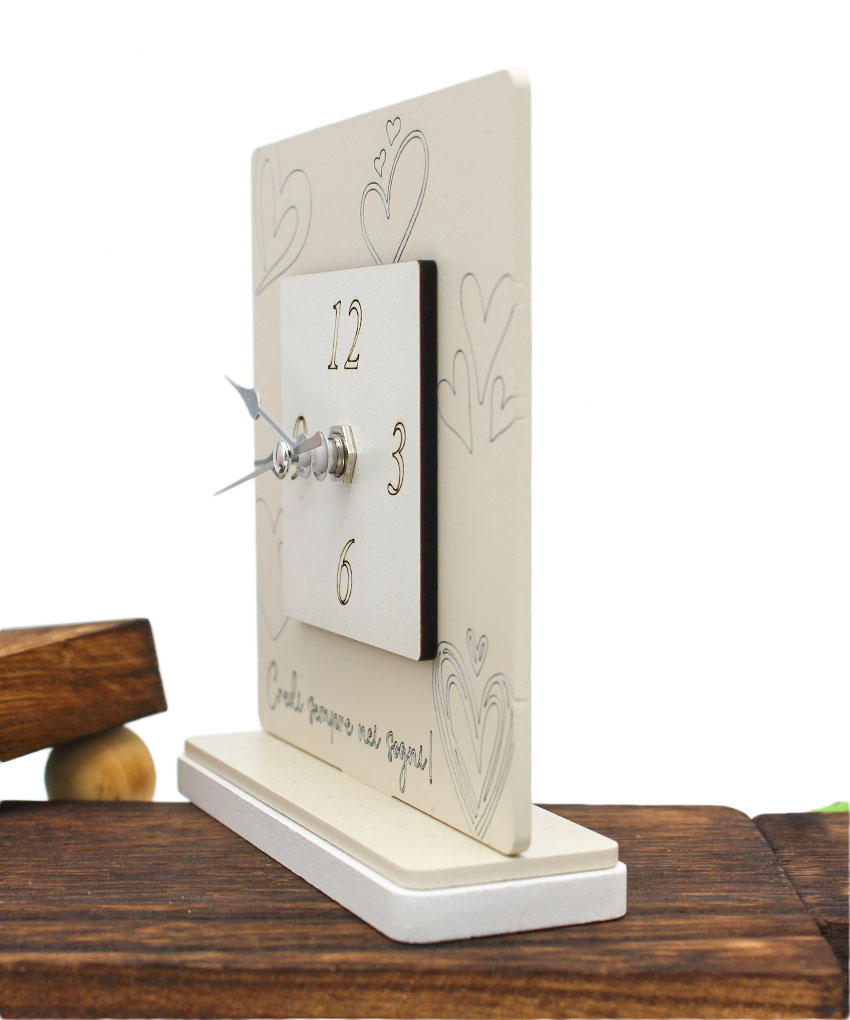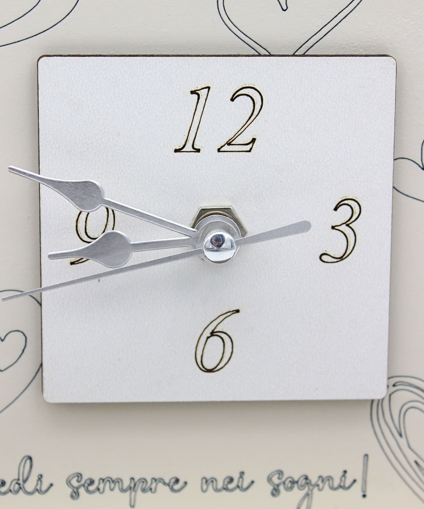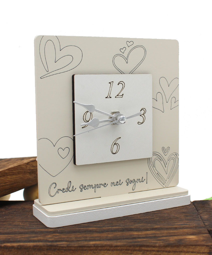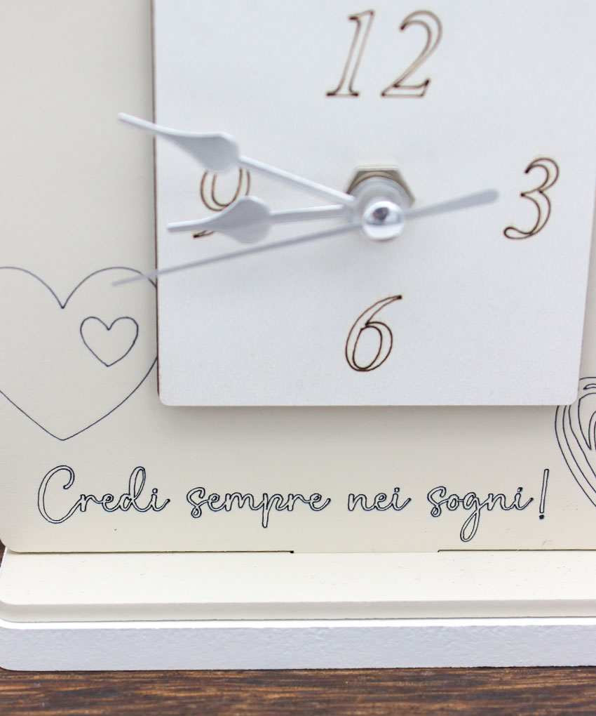 Tipologia: Orologio da appoggio/quadro decorativo – Decorazione: Cuori e frase “Credi sempre nei sogni” – Colore: Beige – Materiale: Legno intagliato al laser – Misura: 12 × 13,5 cm
