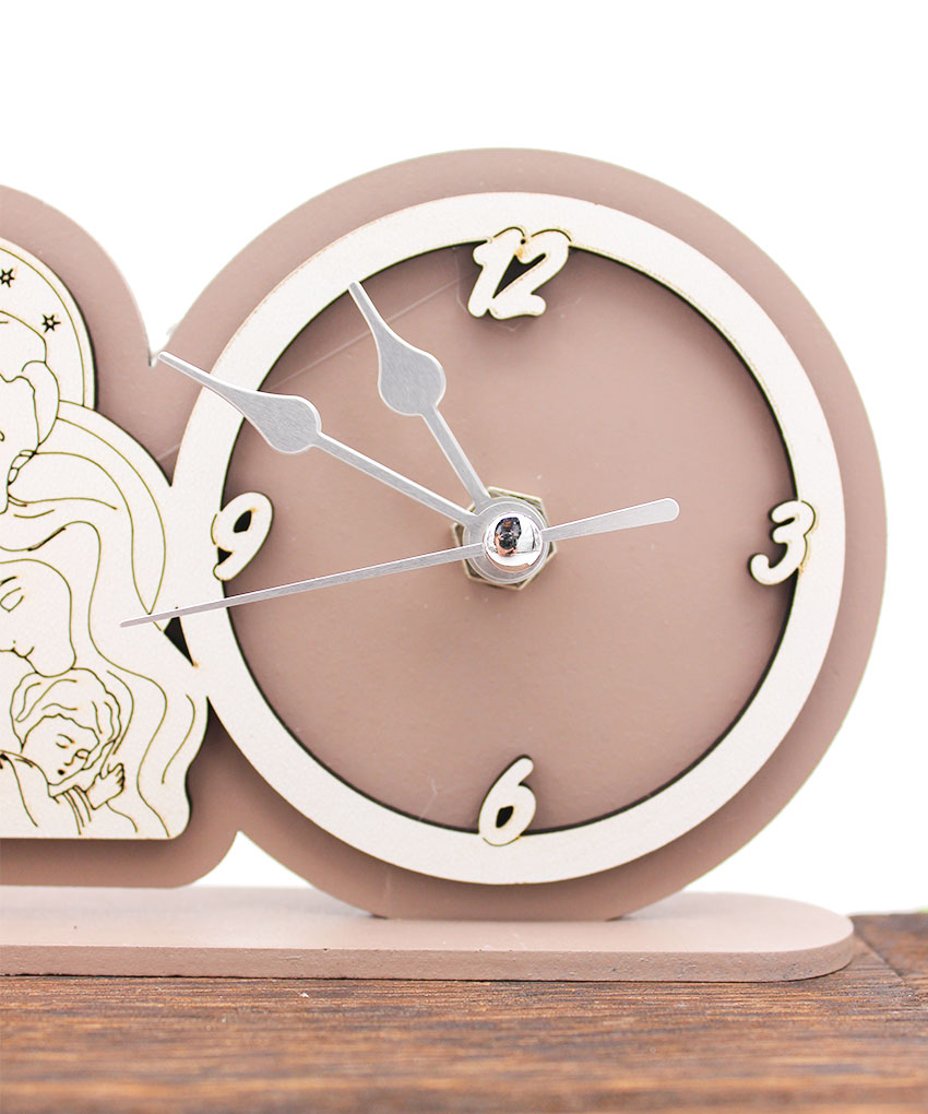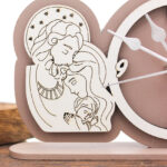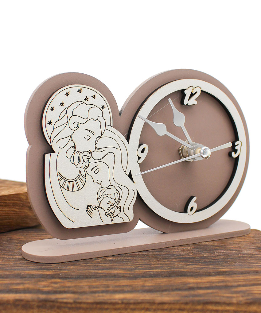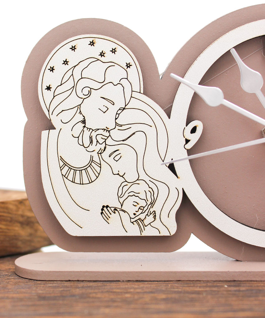 Una bomboniera dal forte valore simbolico, perfetta per eventi religiosi e cerimonie speciali. Questo orologio Tondo decorativo raffigurante la Sacra Famiglia è realizzato in legno intagliato al laser, disponibile in due tonalità eleganti: sabbia e fango.