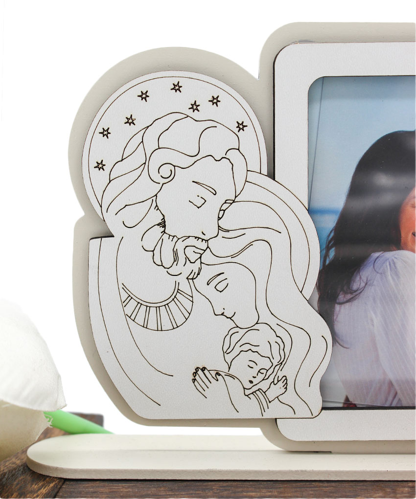 Un dono ricco di significato, perfetto per eventi religiosi o come ricordo di un giorno speciale. La Bomboniera economica portafoto sacra famiglia, realizzato in legno intagliato al laser, unisce spiritualità, eleganza e convenienza in un’unica bomboniera.