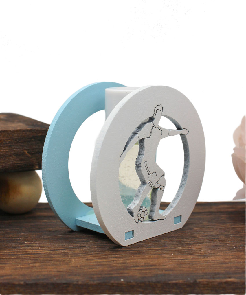 Tipologia: Profumatore per ambiente – Design: Calciatore Celeste – Materiale: Legno intagliato al laser – Colore: Bianco e Celeste