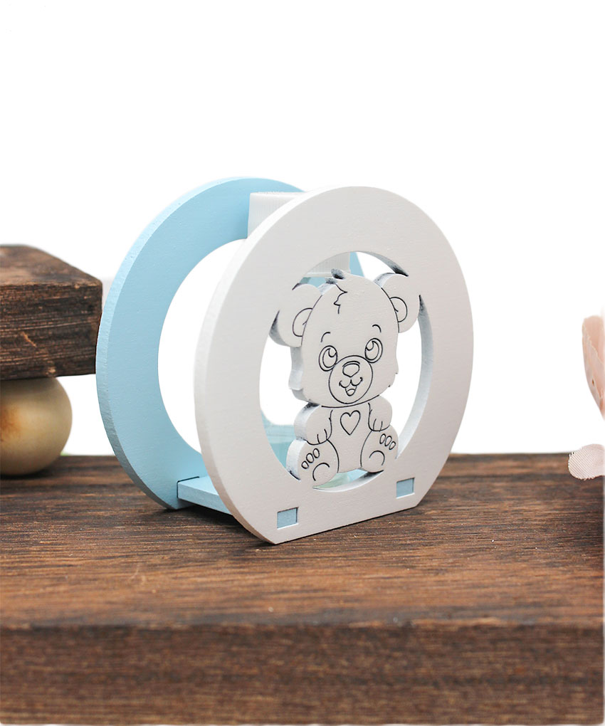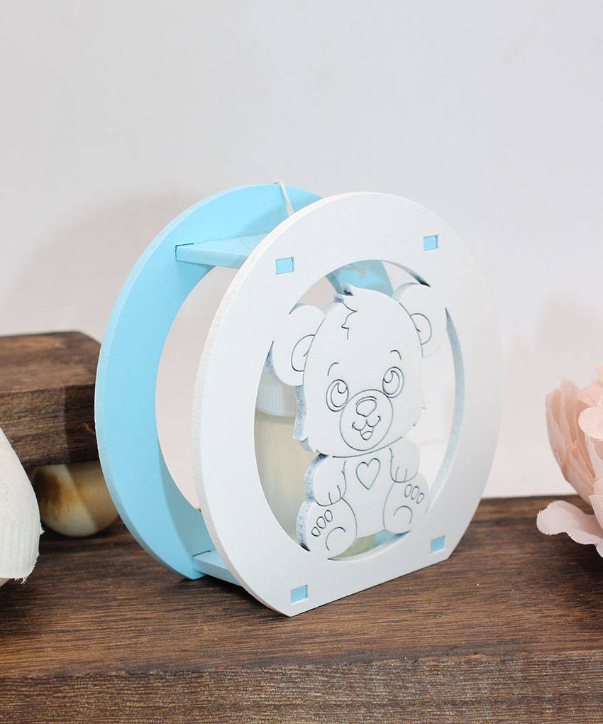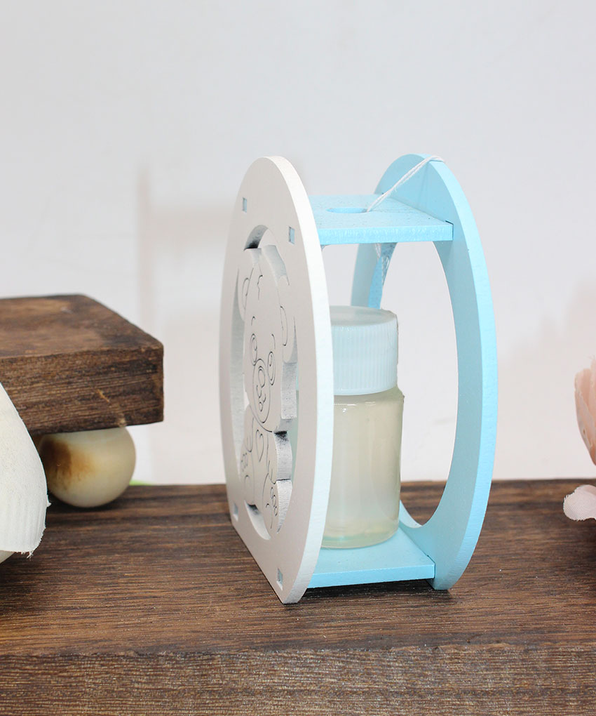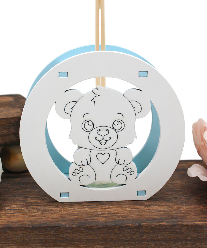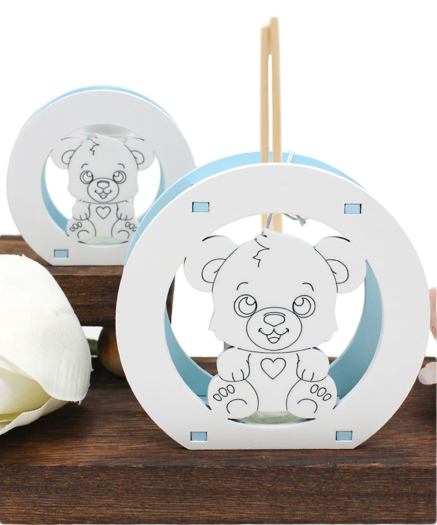 Tipologia: Profumatore per ambiente – Design: Orsetto Celeste – Materiale: Legno intagliato al laser – Colore: Bianco e Celeste