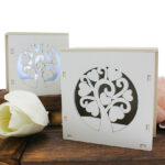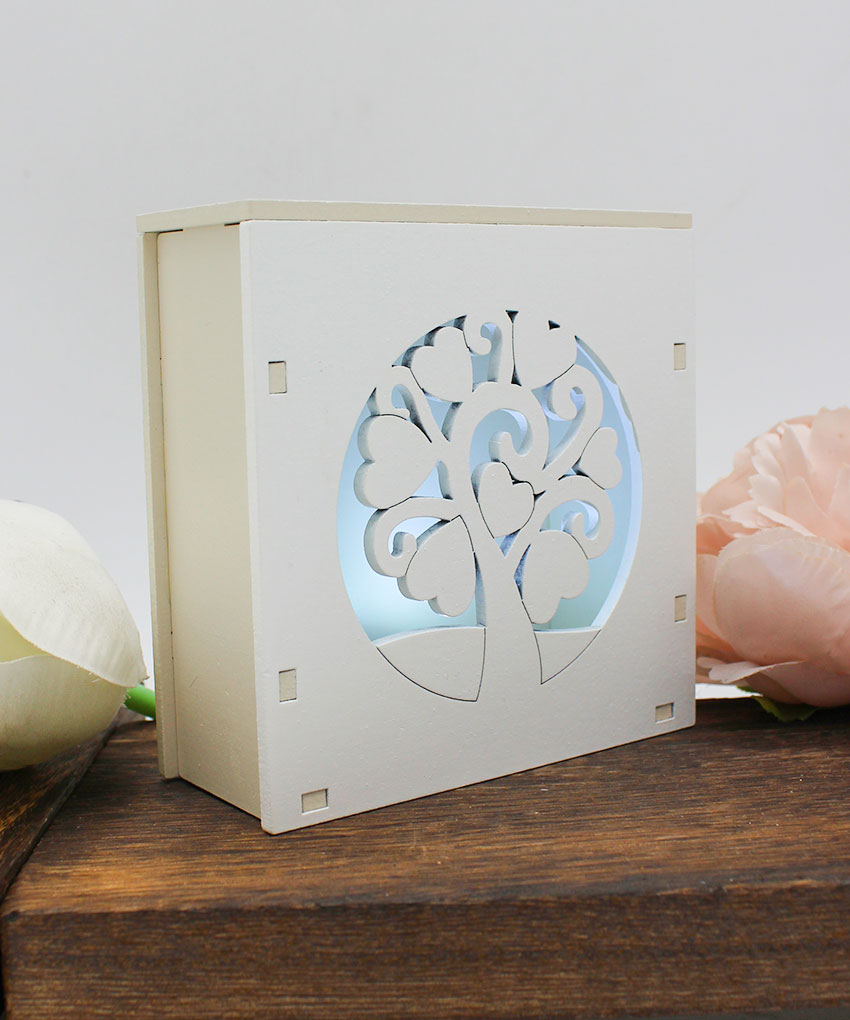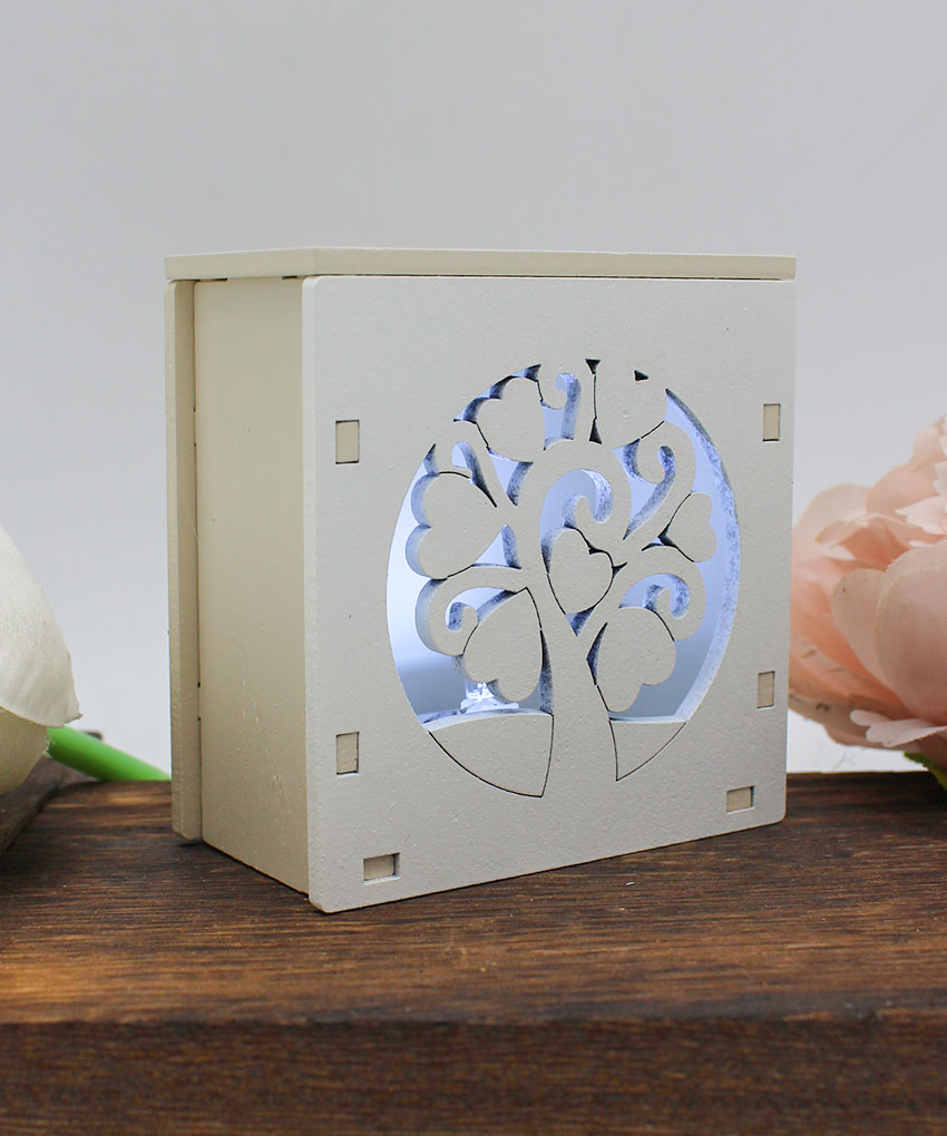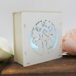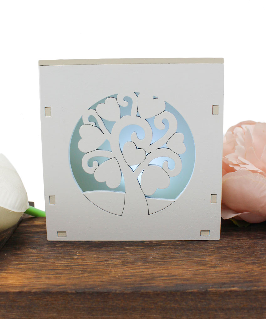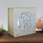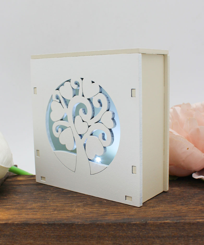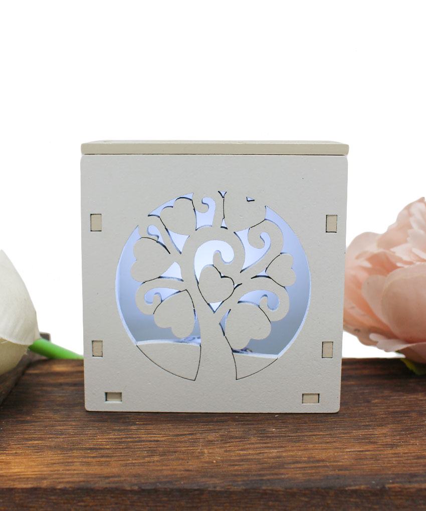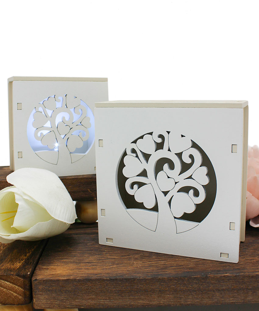 bomboniera economica LED – Sorprendi i tuoi invitati con una bomboniera originale ed elegante: una scatolina in legno intagliato al laser con luce LED che raffigura un Albero della Vita. Un ricordo suggestivo e luminoso, perfetto per ricco di emozioni.