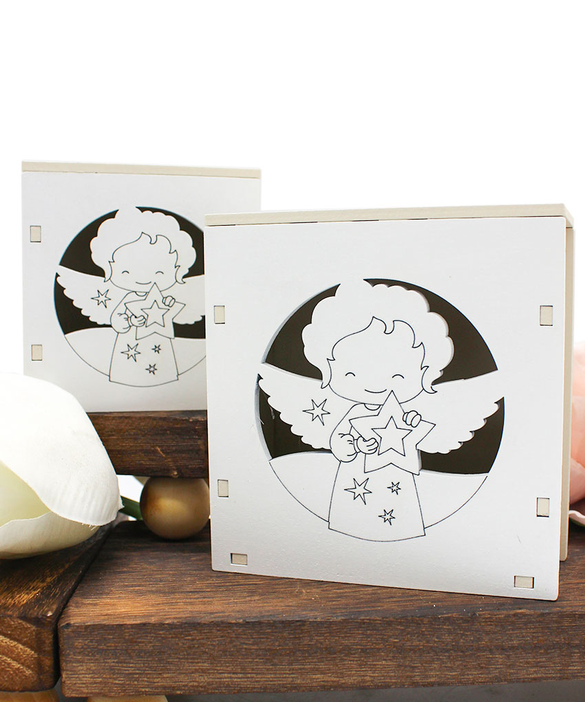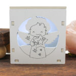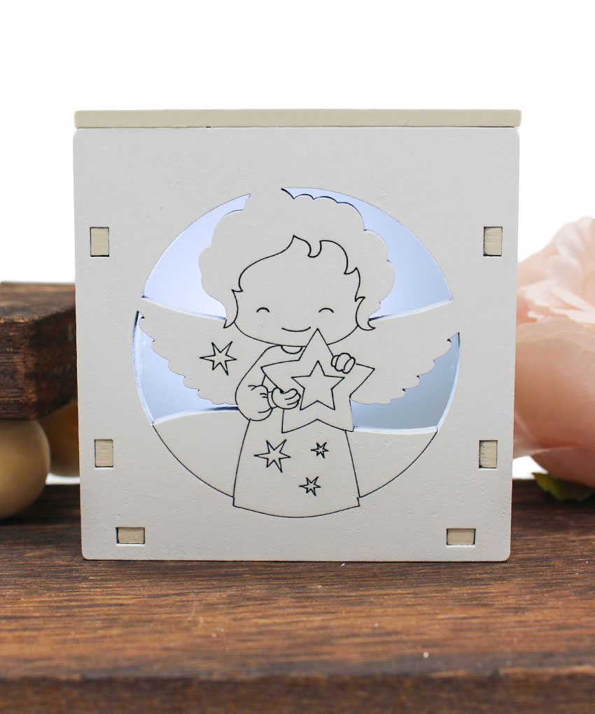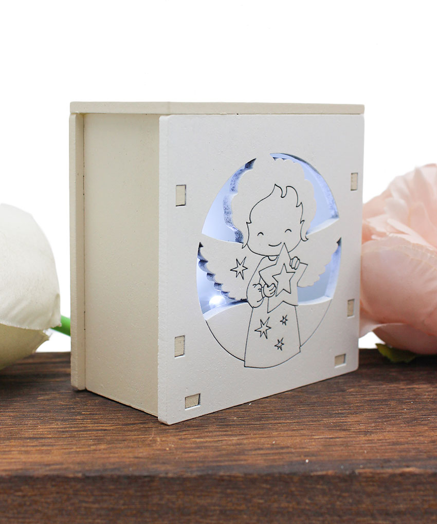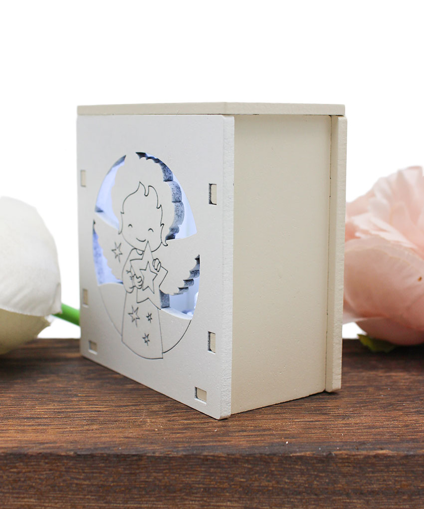 bomboniera economica LED – Sorprendi i tuoi invitati con una bomboniera originale ed elegante: una scatolina in legno intagliato al laser con luce LED che raffigura un Angioletto. Un ricordo suggestivo e luminoso, perfetto per ricco di emozioni.