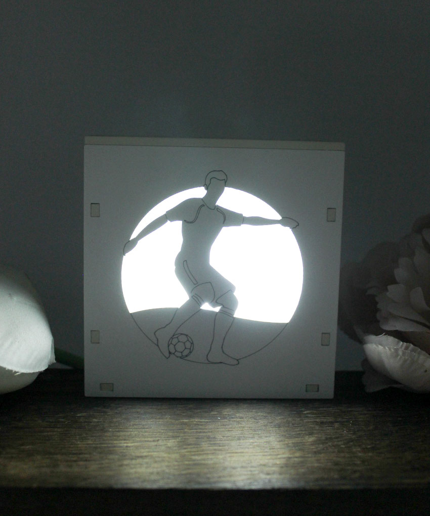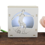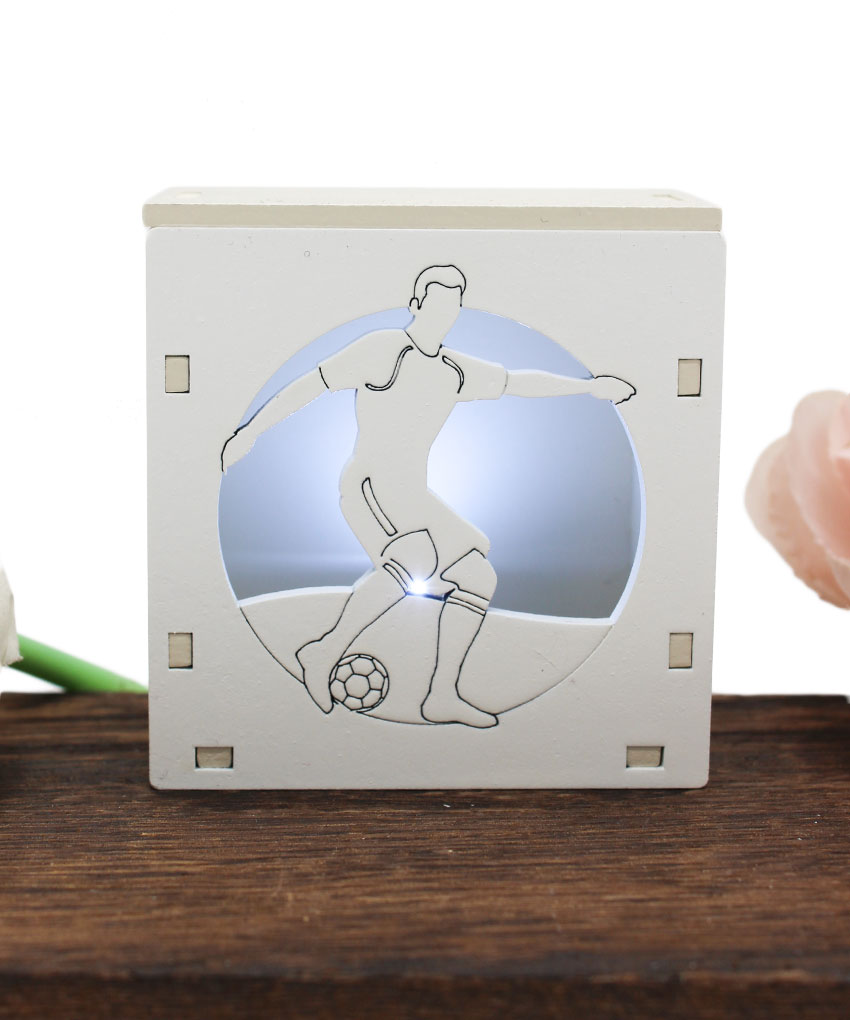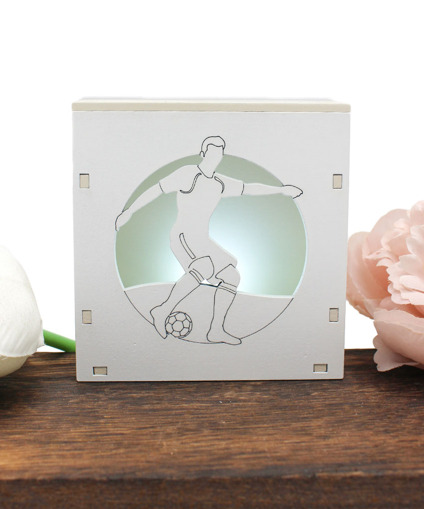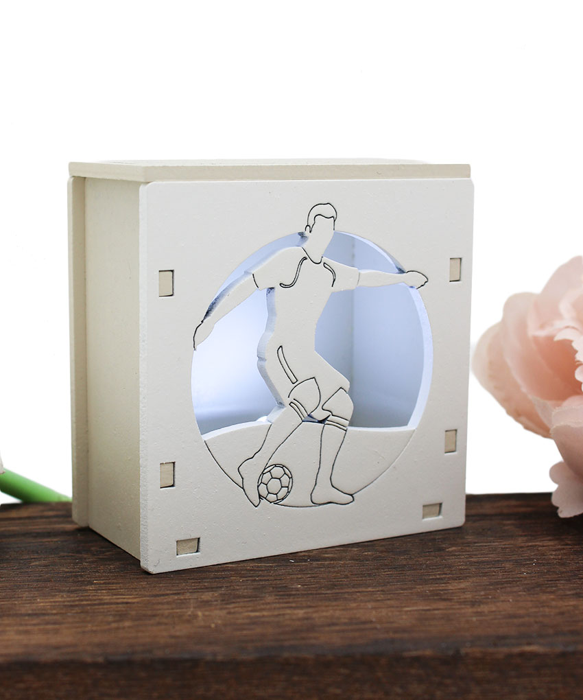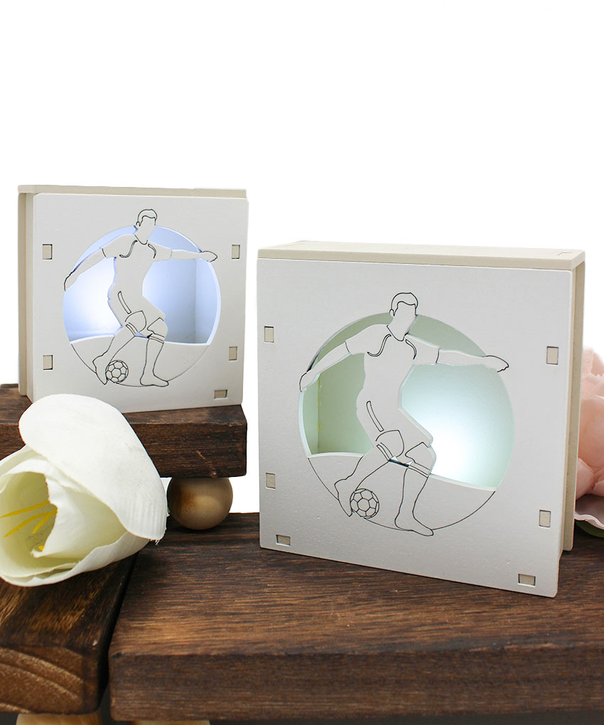 bomboniera economica LED – Sorprendi i tuoi invitati con una bomboniera originale ed elegante: una scatolina in legno intagliato al laser con luce LED che raffigura un Calciatore. Un ricordo suggestivo e luminoso, perfetto per ricco di emozioni.