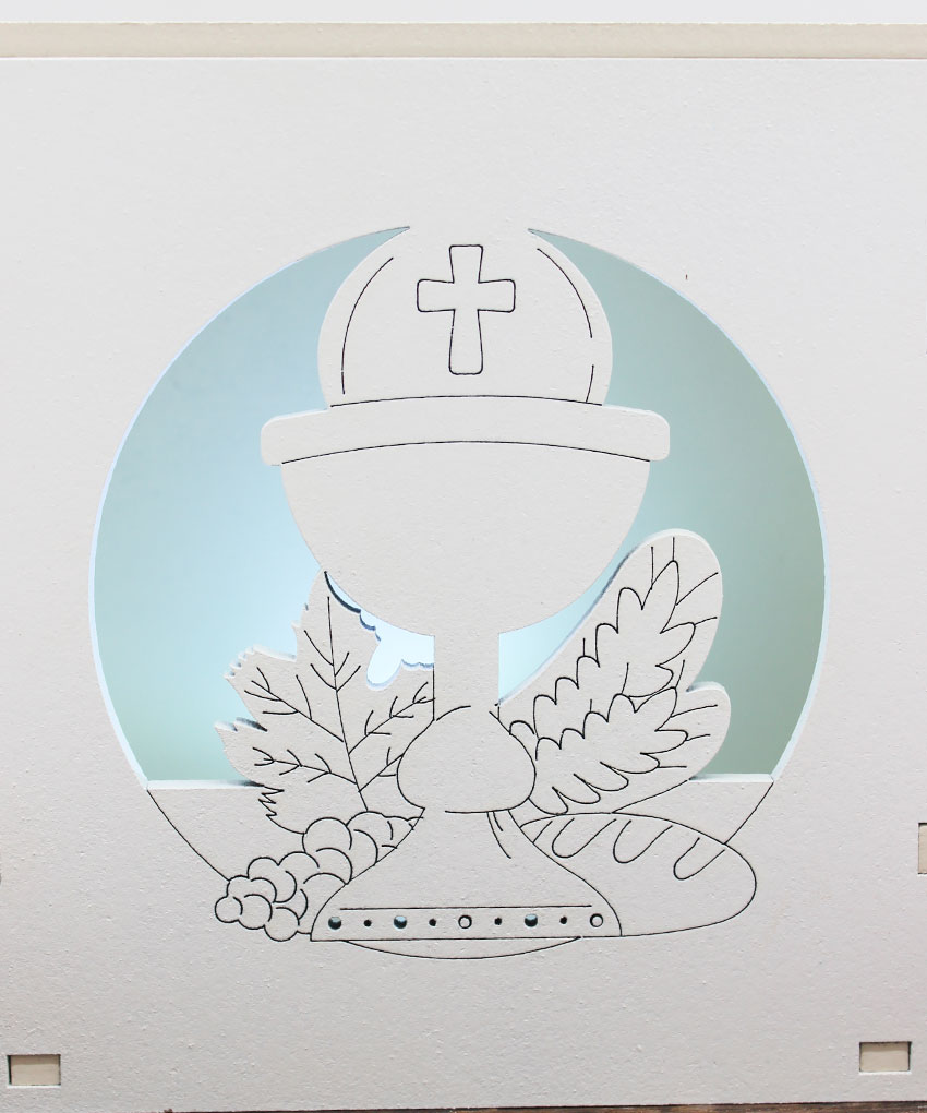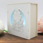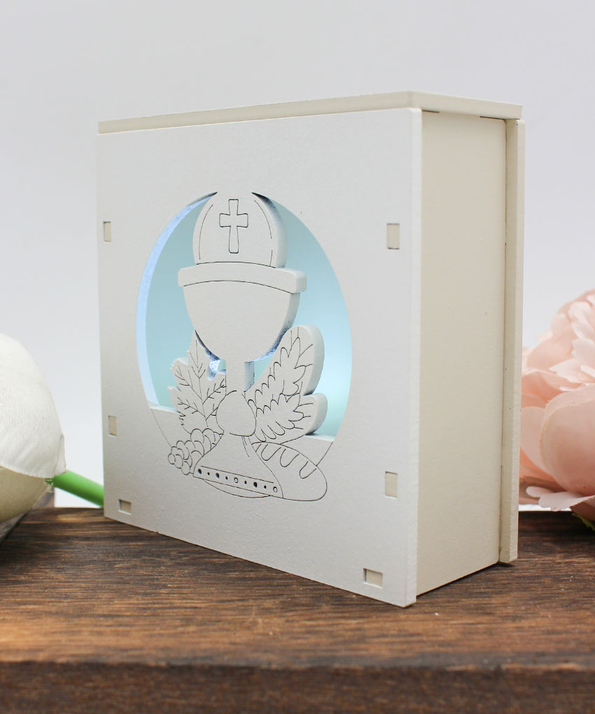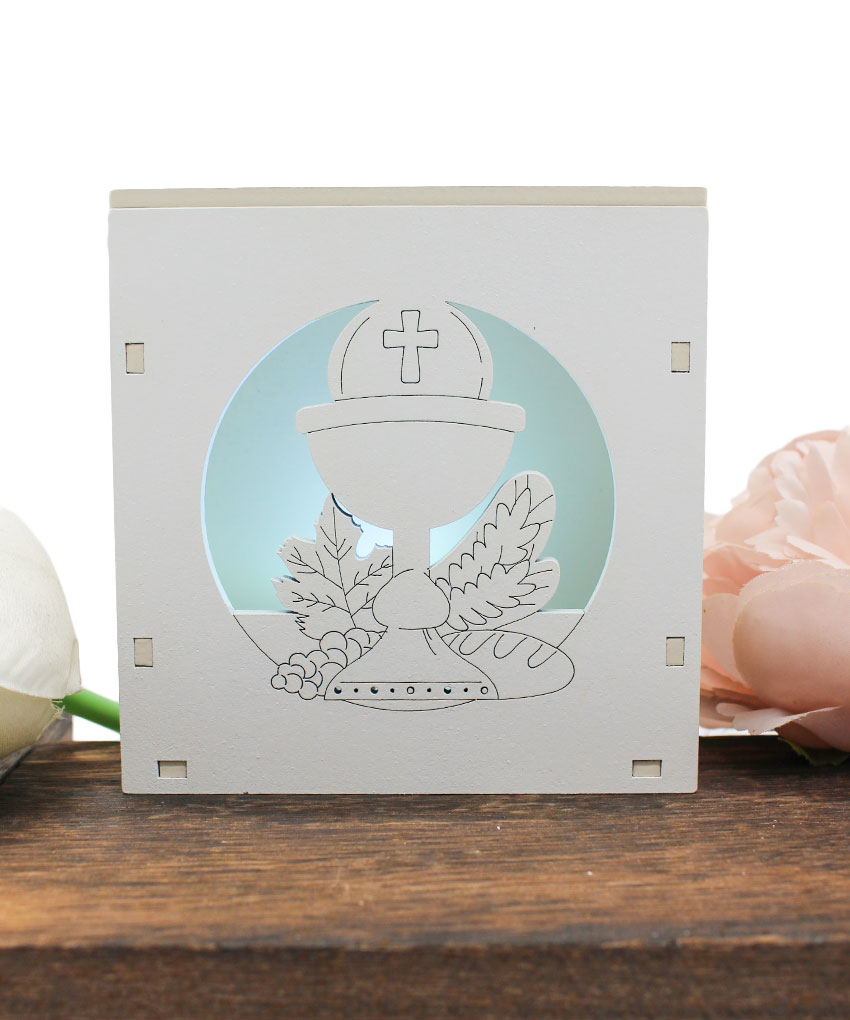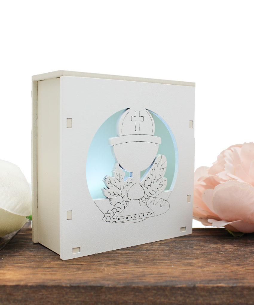 bomboniera economica LED – Sorprendi i tuoi invitati con una bomboniera originale ed elegante: una scatolina in legno intagliato al laser con luce LED che raffigura un Calice Comunione. Un ricordo suggestivo e luminoso, perfetto per ricco di emozioni.